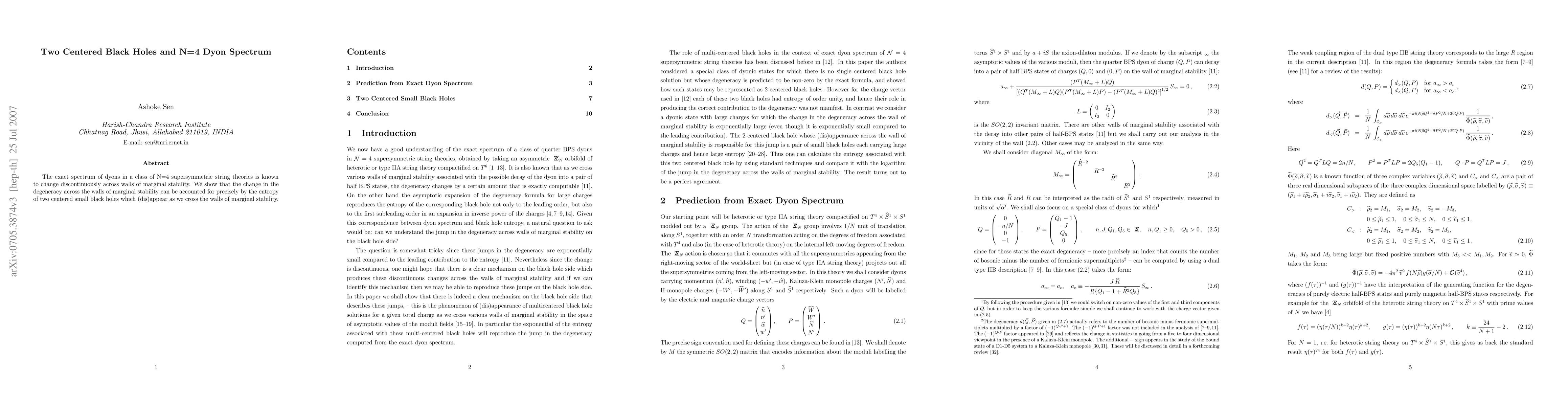 The paper presents a detailed analysis linking the entropy of two-centered black holes to the discontinuities in dyon degeneracy across walls of marginal stability in N=4 supersymmetric string theories.