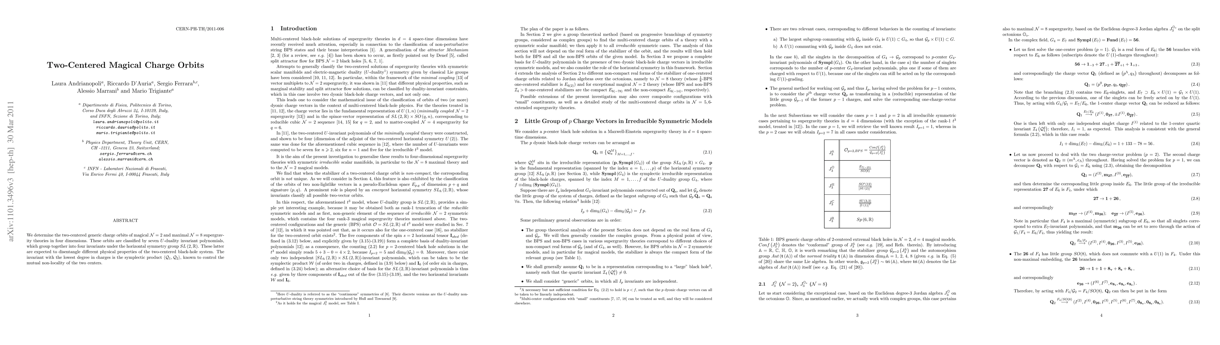 We determine the two-centered generic charge orbits of magical N = 2 and maximal N = 8 supergravity theories in four dimensions. These orbits are classified by seven U-duality invariant polynomials, which group together into four invariants under the horizontal symmetry group SL(2,R). These latter are expected to disentangle different physical properties of the two-centered black-hole system. The invariant with the lowest degree in charges is the symplectic product (Q1,Q2), known to control the mutual non-locality of the two centers.