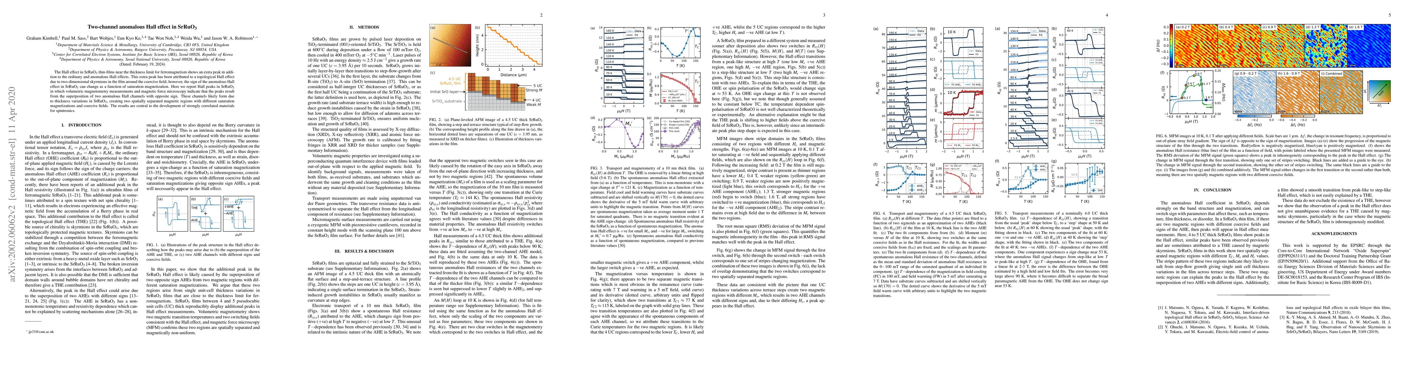 The study reveals two-channel anomalous Hall effect in SrRuO$_3$ thin-films, attributing the extra Hall peak to two spatially separated magnetic regions with different saturation magnetizations and coercive fields. This insight is crucial for advancing spintronics in strongly correlated materials.