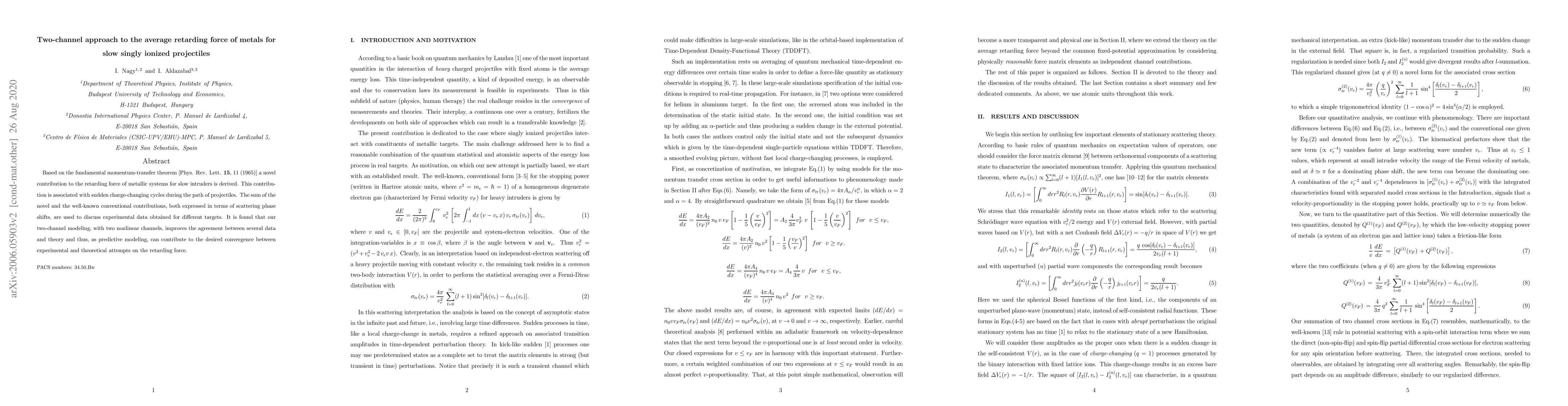 Based on the fundamental momentum-transfer theorem [Phys. Rev. Lett. 15, 11 (1965)] a novel contribution to the retarding force of metallic systems for slow intruders is derived. This contribution is associated with sudden charge-changing cycles during the path of projectiles. The sum of the novel and the well-known conventional contributions, both expressed in terms of scattering phase shifts, are used to discuss experimental data obtained for different targets. It is found that our two-channel modeling, with two nonlinear channels, improves the agreement between several data and theory and thus, as predictive modeling, can contribute to the desired convergence between experimental and theoretical attempts on the retarding force.