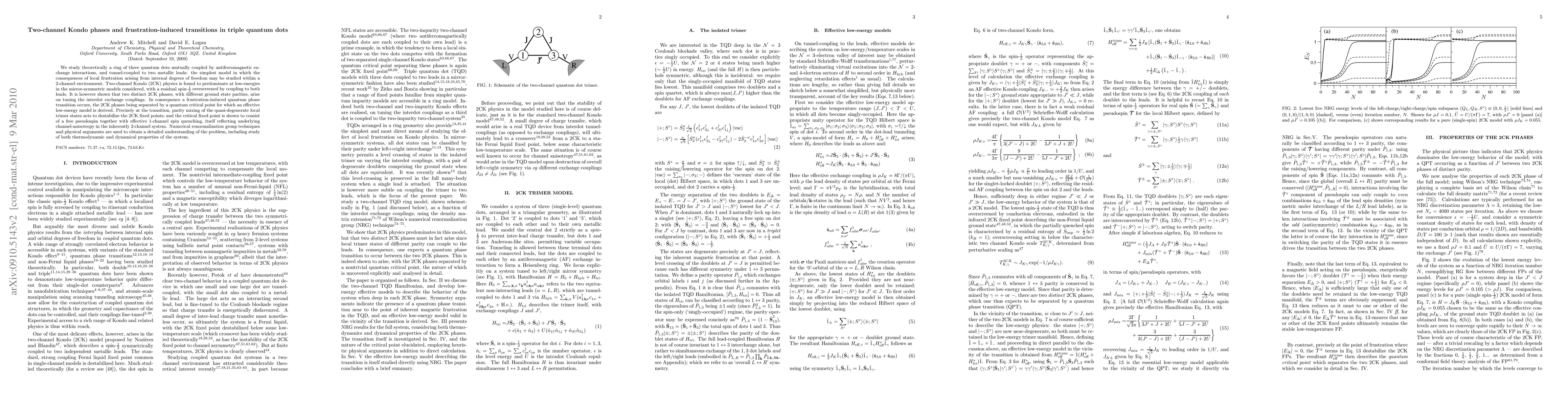 We consider a ring of three quantum dots mutually coupled by antiferromagnetic exchange interactions, and tunnel-coupled to two metallic leads: the simplest device in which the consequences of local frustration arising from internal degrees of freedom may be studied within a 2-channel environment. Two-channel Kondo (2CK) physics is found to predominate at low-energies in the mirror-symmetric systems considered, with a residual spin 1/2 overscreened by coupling to both leads. It is however shown that two distinct 2CK phases, with different ground state parities, arise on tuning the interdot exchange couplings. In consequence a frustration-induced quantum phase transition occurs, the 2CK phases being separated by a quantum critical point for which an effective low-energy model is derived. Precisely at the transition, parity mixing of the quasi-degenerate local trimer states acts to destabilise the 2CK fixed points; and the critical fixed point is shown to consist of a free pseudospin together with effective 1-channel spin quenching, itself reflecting underlying channel-anisotropy in the inherently 2-channel system. Numerical renormalization group techniques and physical arguments are used to obtain a detailed understanding of the problem, including study of both thermodynamic and dynamical properties of the system.
