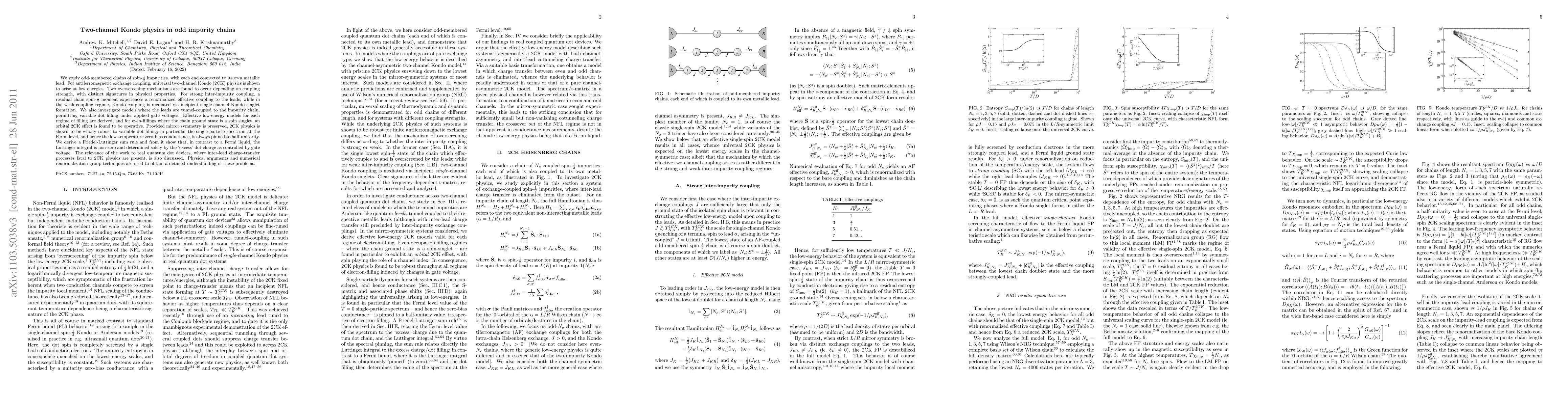 We study odd-membered chains of spin-(1/2) impurities, with each end connected to its own metallic lead. For antiferromagnetic exchange coupling, universal two-channel Kondo (2CK) physics is shown to arise at low energies. Two overscreening mechanisms are found to occur depending on coupling strength, with distinct signatures in physical properties. For strong inter-impurity coupling, a residual chain spin-(1/2) moment experiences a renormalized effective coupling to the leads; while in the weak-coupling regime, Kondo coupling is mediated via incipient single-channel Kondo singlet formation. We also investigate models where the leads are tunnel-coupled to the impurity chain, permitting variable dot filling under applied gate voltages. Effective low-energy models for each regime of filling are derived, and for even-fillings where the chain ground state is a spin singlet, an orbital 2CK effect is found to be operative. Provided mirror symmetry is preserved, 2CK physics is shown to be wholly robust to variable dot filling; in particular the single-particle spectrum at the Fermi level, and hence the low-temperature zero-bias conductance, is always pinned to half-unitarity. We derive a Friedel-Luttinger sum rule and from it show that, in contrast to a Fermi liquid, the Luttinger integral is non-zero and determined solely by the `excess' dot charge as controlled by gate voltage. The relevance of the work to real quantum dot devices, where inter-lead charge-transfer processes fatal to 2CK physics are present, is also discussed. Physical arguments and numerical renormalization group techniques are used to obtain a detailed understanding of these problems.