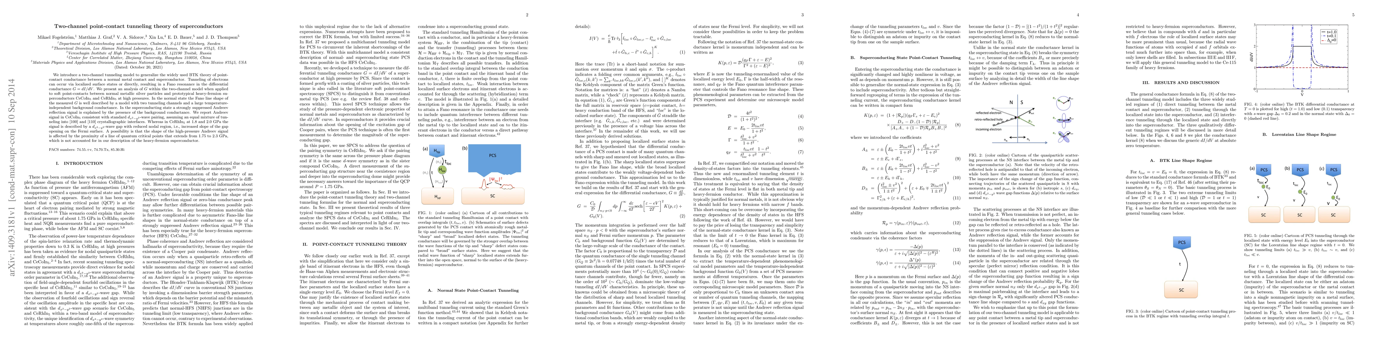 We introduce a two-channel tunneling model to generalize the widely used BTK theory of point-contact conductance between a normal metal contact and superconductor. Tunneling of electrons can occur via localized surface states or directly, resulting in a Fano resonance in the differential conductance $G=dI/dV$. We present an analysis of $G$ within the two-channel model when applied to soft point-contacts between normal metallic silver particles and prototypical heavy-fermion superconductors CeCoIn$_5$ and CeRhIn$_5$ at high pressures. In the normal state the Fano line shape of the measured $G$ is well described by a model with two tunneling channels and a large temperature-independent background conductance. In the superconducting state a strongly suppressed Andreev reflection signal is explained by the presence of the background conductance. We report Andreev signal in CeCoIn$_5$ consistent with standard $d_{x^2-y^2}$-wave pairing, assuming an equal mixture of tunneling into [100] and [110] crystallographic interfaces. Whereas in CeRhIn$_5$ at 1.8 and 2.0 GPa the signal is described by a $d_{x^2-y^2}$-wave gap with reduced nodal region, i.e., increased slope of the gap opening on the Fermi surface. A possibility is that the shape of the high-pressure Andreev signal is affected by the proximity of a line of quantum critical points that extends from 1.75 to 2.3 GPa, which is not accounted for in our description of the heavy-fermion superconductor.