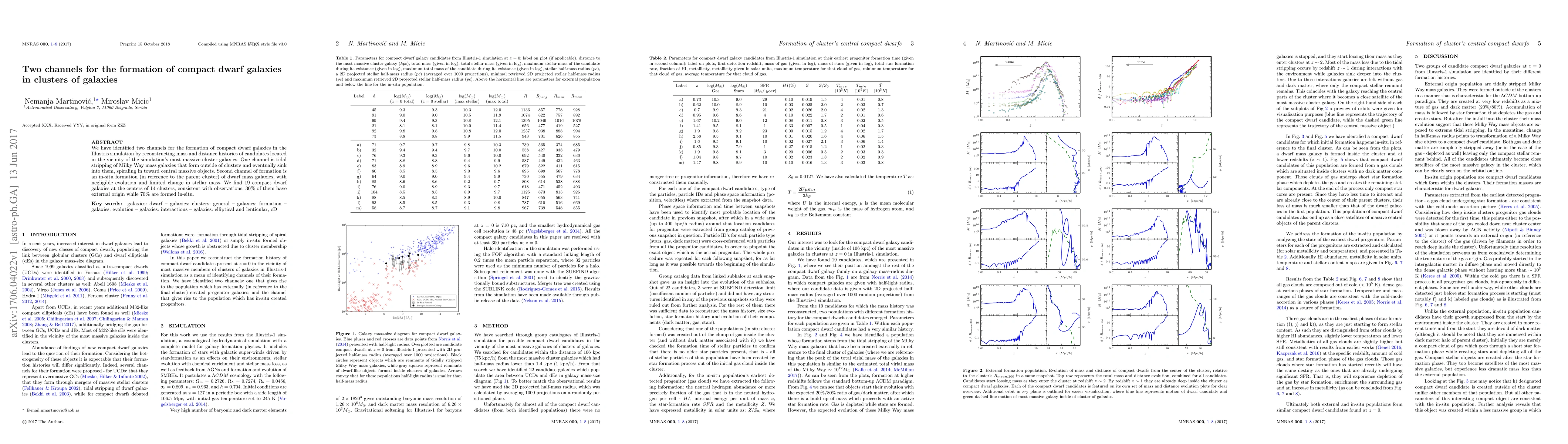 This paper identifies two formation channels for compact dwarf galaxies in clusters: tidal stripping of larger galaxies that migrate into clusters and in-situ formation of dwarf galaxies within the cluster environment. The study finds that 30% of compact dwarfs originate externally, while 70% form in-situ, consistent with observational data.