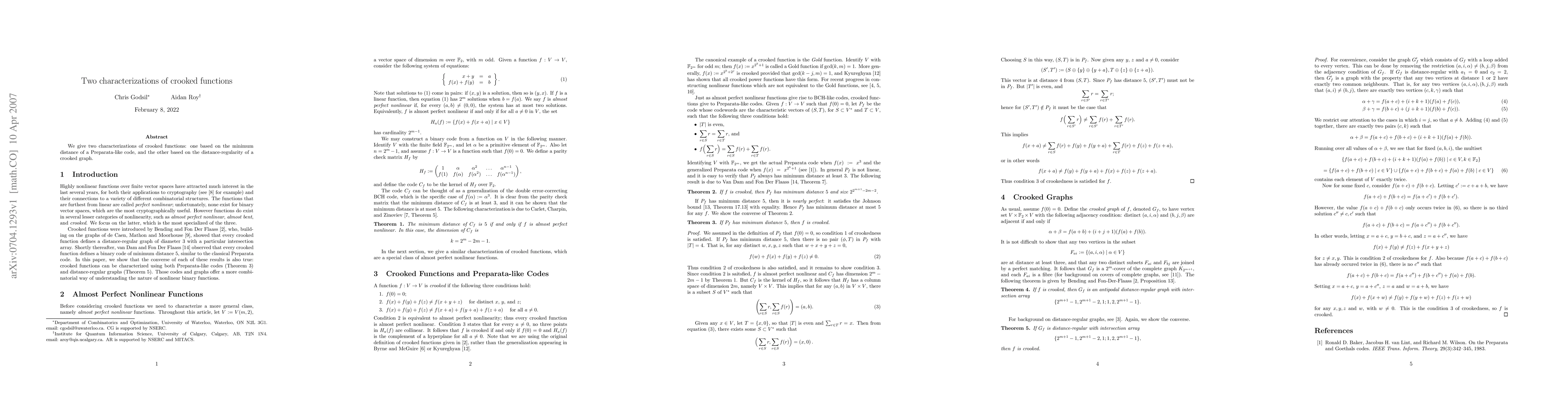 We give two characterizations of crooked functions: one based on the minimum distance of a Preparata-like code, and the other based on the distance-regularity of a crooked graph.