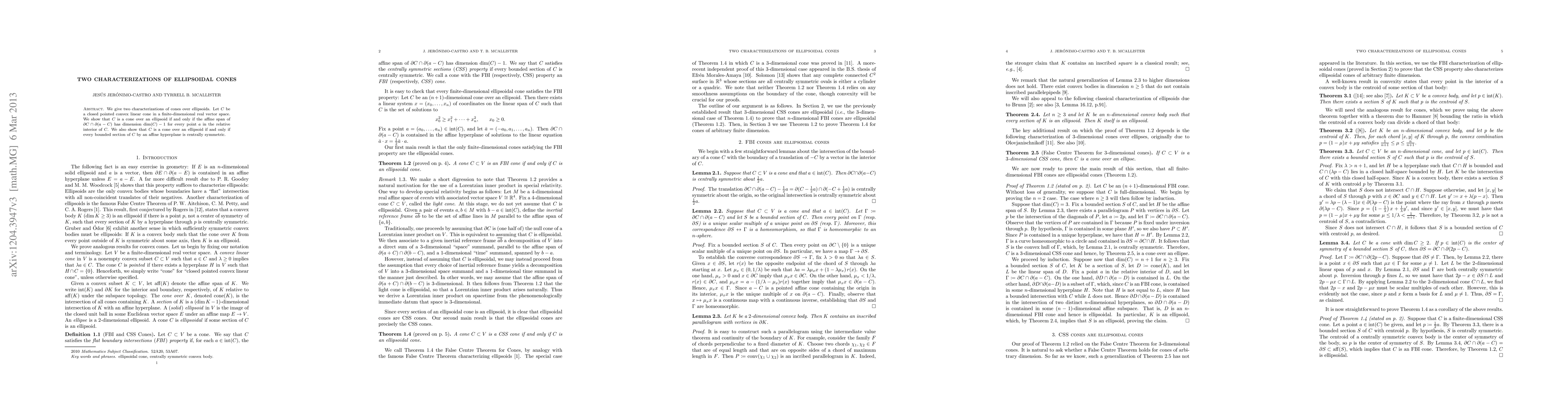 This paper provides two characterizations of cones over ellipsoids: one based on the dimension of the affine span of the boundary intersection, and the other on the central symmetry of bounded sections by affine hyperplanes.