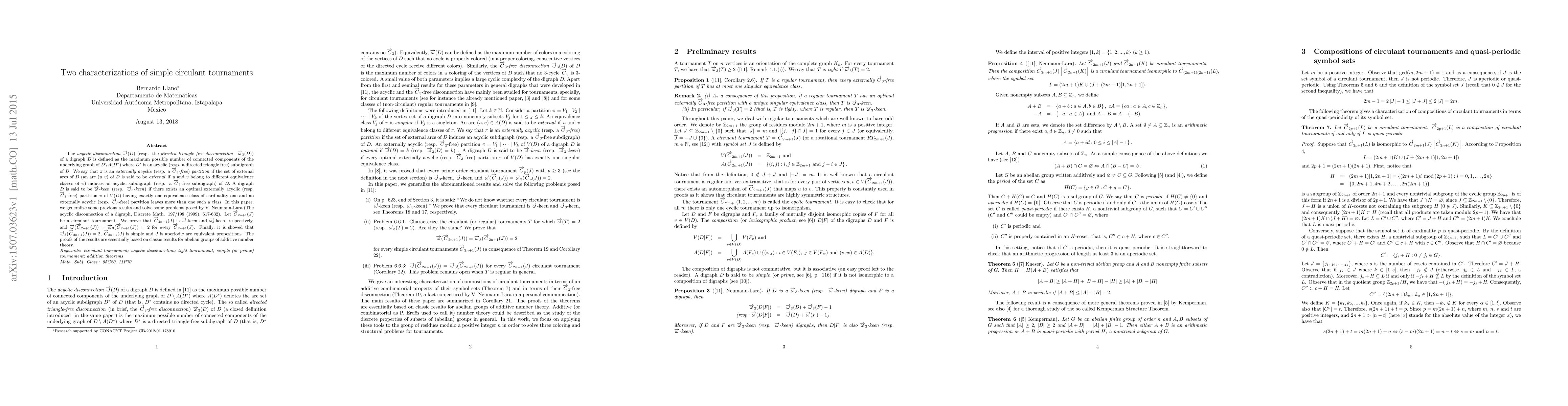 The \textit{acyclic disconnection} $\overrightarrow{\omega }(D)$ (resp. the \textit{directed triangle free disconnection } $\overrightarrow{\omega }_{3}(D)$) of a digraph $D$ is defined as the maximum possible number of connected components of the underlying graph of $D\setminus A(D^{\ast })$ where $D^{\ast }$ is an acyclic (resp. a directed triangle free) subdigraph of $D$. In this paper, we generalize some previous results and solve some problems posed by V. Neumann-Lara (The acyclic disconnection of a digraph, Discrete Math. 197/198 (1999), 617-632). Let $\overrightarrow{C}_{2n+1}(J)$ be a circulant tournament. We prove that $\overrightarrow{C}_{2n+1}(J)$ is $\overrightarrow{% \omega }$-keen and $\overrightarrow{\omega _{3}}$-keen, respectively, and $% \overrightarrow{\omega }(\overrightarrow{C}_{2n+1}(J))=\overrightarrow{% \omega }_{3}(\overrightarrow{C}_{2n+1}(J))=2$ for every $\overrightarrow{C}% _{2n+1}(J)$. Finally, it is showed that $\overrightarrow{\omega }_{3}(% \overrightarrow{C}_{2n+1}(J))=2$, $\overrightarrow{C}_{2n+1}(J)$ is simple and $J$ is aperiodic are equivalent propositions.