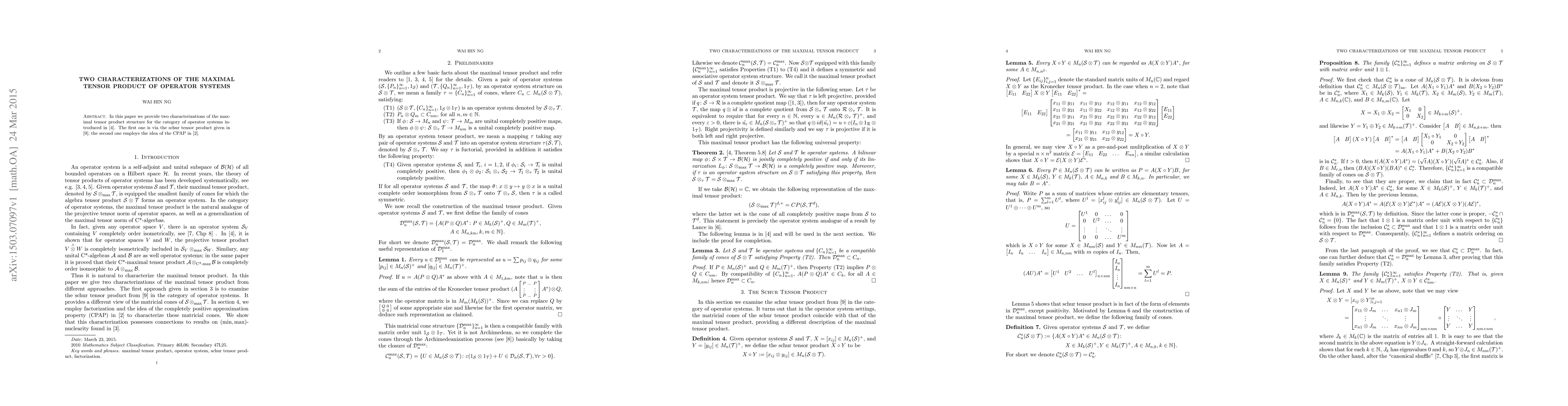 This paper characterizes the maximal tensor product of operator systems through the Schur tensor product and the completely positive approximation property (CPAP). Both approaches offer distinct insights into the structure of operator systems.