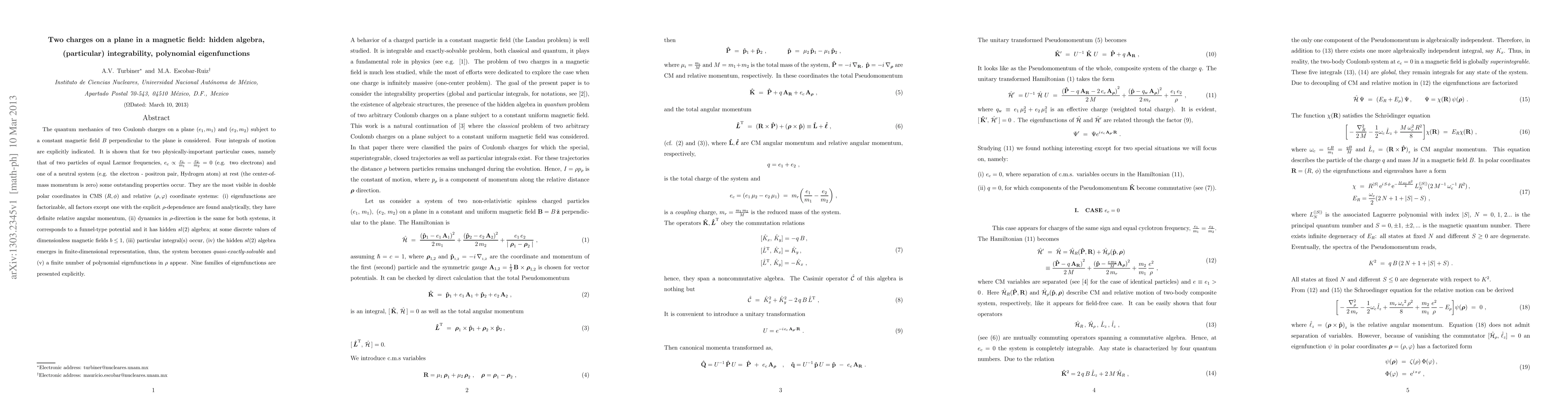 This paper explores the quantum mechanics of two Coulomb charges in a magnetic field, highlighting four integrals of motion. It reveals that for specific cases like equal Larmor frequency particles and neutral systems at rest, the eigenfunctions are factorizable with definite relative angular momentum, and the dynamics exhibit hidden $sl(2)$ algebra, leading to quasi-exact solvability and polynomial eigenfunctions.