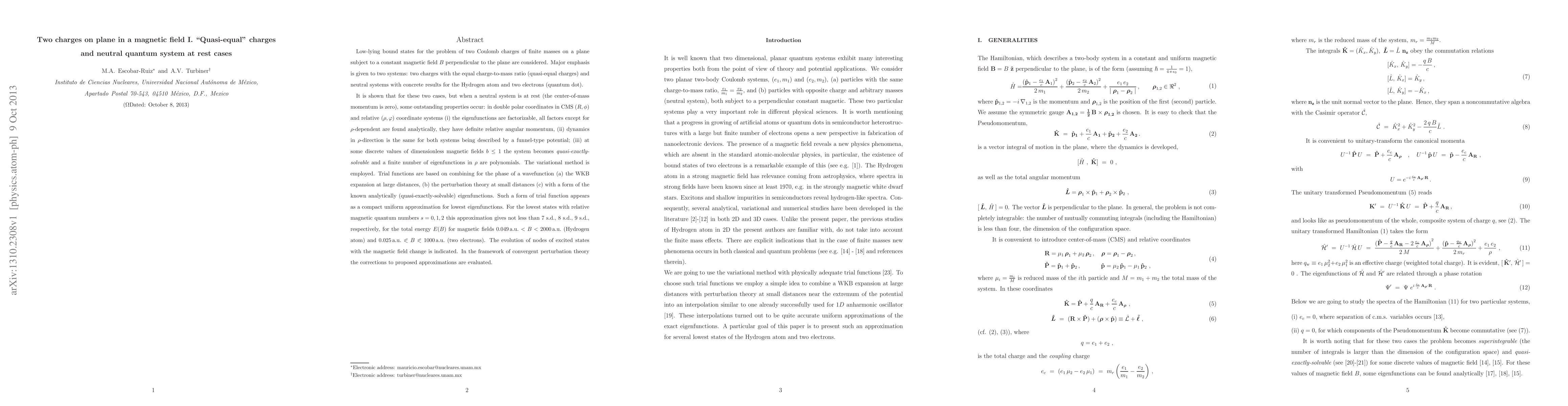 Low-lying bound states for the problem of two Coulomb charges of finite masses on a plane subject to a constant magnetic field $B$ perpendicular to the plane are considered. Major emphasis is given to two systems: two charges with the equal charge-to-mass ratio (quasi-equal charges) and neutral systems with concrete results for the Hydrogen atom and two electrons (quantum dot). It is shown that for these two cases, but when a neutral system is at rest (the center-of-mass momentum is zero), some outstanding properties occur: in double polar coordinates in CMS $(R, \phi)$ and relative $(\rho, \varphi)$ coordinate systems (i) the eigenfunctions are factorizable, all factors except for $\rho$-dependent are found analytically, they have definite relative angular momentum, (ii) dynamics in $\rho$-direction is the same for both systems being described by a funnel-type potential; (iii) at some discrete values of dimensionless magnetic fields $b \leq 1$ the system becomes {\it quasi-exactly-solvable} and a finite number of eigenfunctions in $\rho$ are polynomials. The variational method is employed. Trial functions are based on combining for the phase of a wavefunction (a) the WKB expansion at large distances, (b) the perturbation theory at small distances (c) with a form of the known analytically (quasi-exactly-solvable) eigenfunctions. For the lowest states with relative magnetic quantum numbers $s=0,1,2$ this approximation gives not less than 7 s.d., 8 s.d., 9 s.d., respectively, for the total energy $E(B)$ for magnetic fields $0.049\, \text{a.u.} < B < 2000\, \text{a.u.} $ (Hydrogen atom) and $0.025\, \text{a.u.}\eqslantless B \eqslantless 1000\, \text{a.u.} $ (two electrons).
