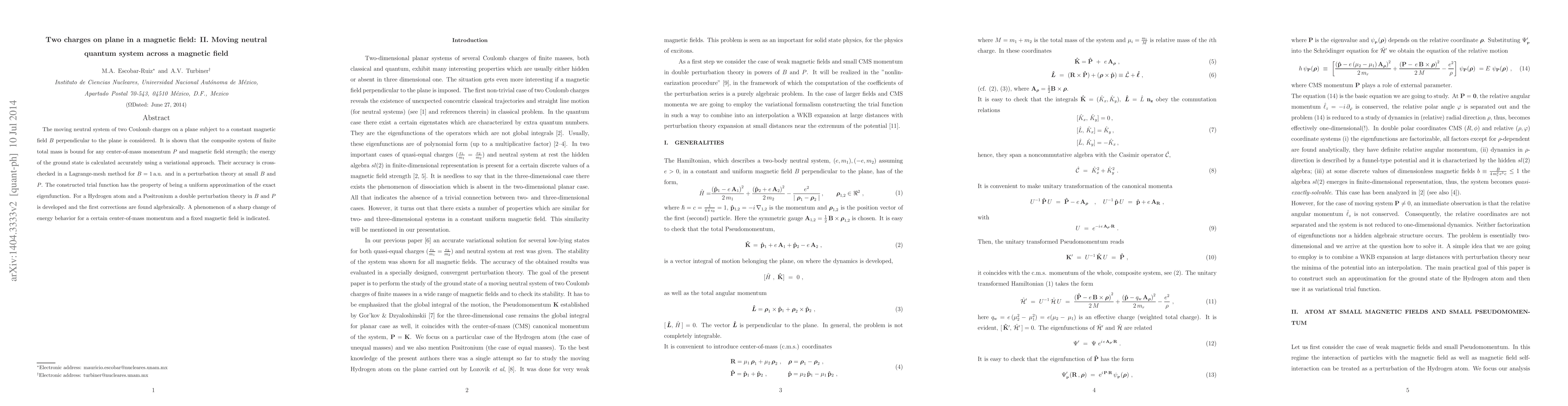 The moving neutral system of two Coulomb charges on a plane subject to a constant magnetic field $B$ perpendicular to the plane is considered. It is shown that the composite system of finite total mass is bound for any center-of-mass momentum $P$ and magnetic field strength; the energy of the ground state is calculated accurately using a variational approach. Their accuracy is cross-checked in a Lagrange-mesh method for $B=1$ a.u. and in a perturbation theory at small $B$ and $P$. The constructed trial function has the property of being a uniform approximation of the exact eigenfunction. For a Hydrogen atom and a Positronium a double perturbation theory in $B$ and $P$ is developed and the first corrections are found algebraically. A phenomenon of a sharp change of energy behavior for a certain center-of-mass momentum and a fixed magnetic field is indicated.
