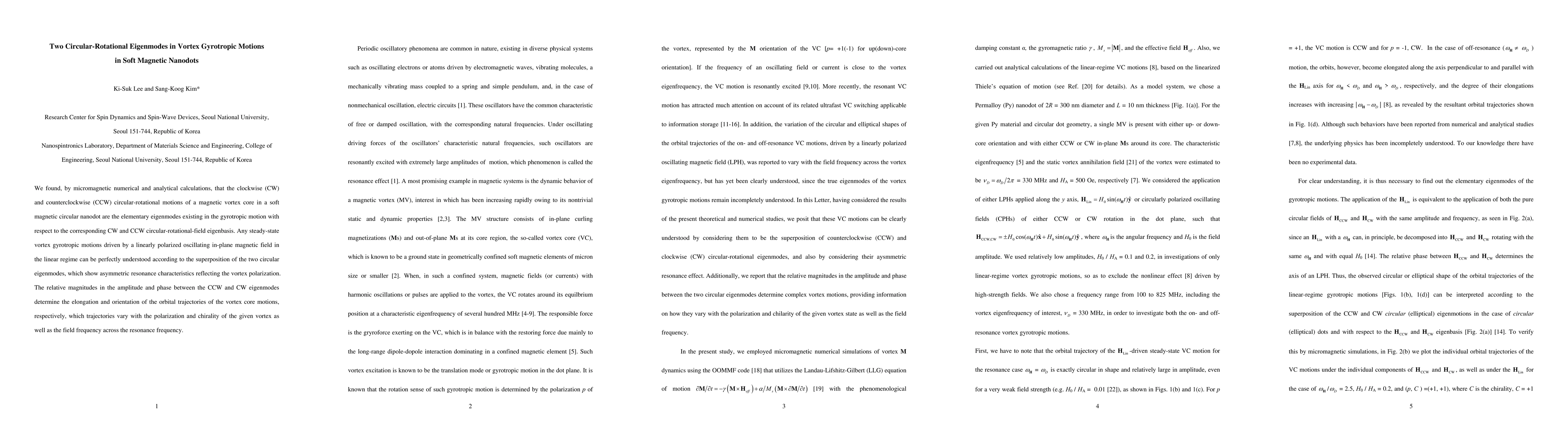 This paper identifies two fundamental circular-rotational eigenmodes in soft magnetic nanodots: clockwise and counterclockwise vortex core motions. These modes determine the gyrotropic motion and resonance characteristics of magnetic vortices under linearly polarized oscillating fields.