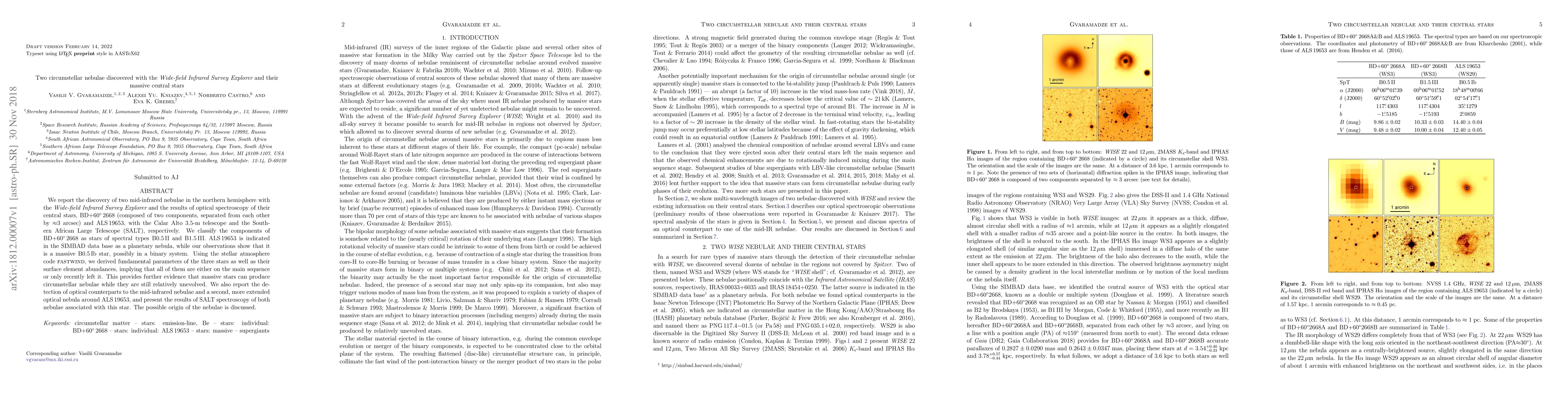 We report the discovery of two mid-infrared nebulae in the northern hemisphere with the Wide-field Infrared Survey Explorer and the results of optical spectroscopy of their central stars, BD+60 2668 (composed of two components, separated from each other by \approx 3 arcsec) and ALS 19653, with the Calar Alto 3.5-m telescope and the Southern African Large Telescope (SALT), respectively. We classify the components of BD+60 2668 as stars of spectral types B0.5 II and B1.5 III. ALS 19653 is indicated in the SIMBAD data base as a planetary nebula, while our observations show that it is a massive B0.5 Ib star, possibly in a binary system. Using the stellar atmosphere code FASTWIND, we derived fundamental parameters of the three stars as well as their surface element abundances, implying that all of them are either on the main sequence or only recently left it. This provides further evidence that massive stars can produce circumstellar nebulae while they are still relatively unevolved. We also report the detection of optical counterparts to the mid-infrared nebulae and a second, more extended optical nebula around ALS 19653, and present the results of SALT spectroscopy of both nebulae associated with this star. The possible origin of the nebulae is discussed.