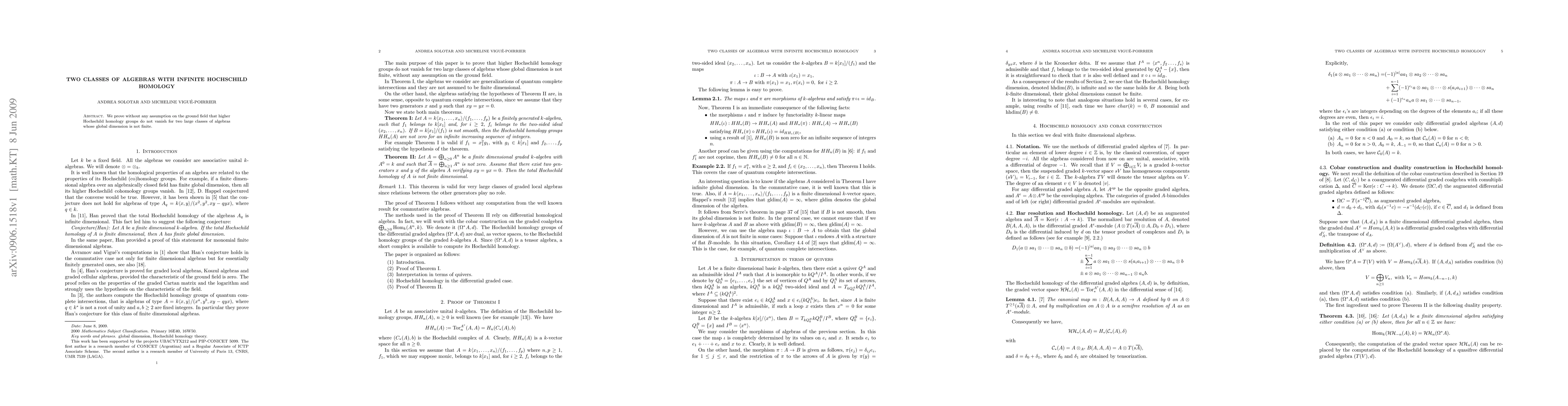 We prove without any assumption on the ground field that higher Hochschild homology groups do not vanish for two large classes of algebras whose global dimension in not finite.
