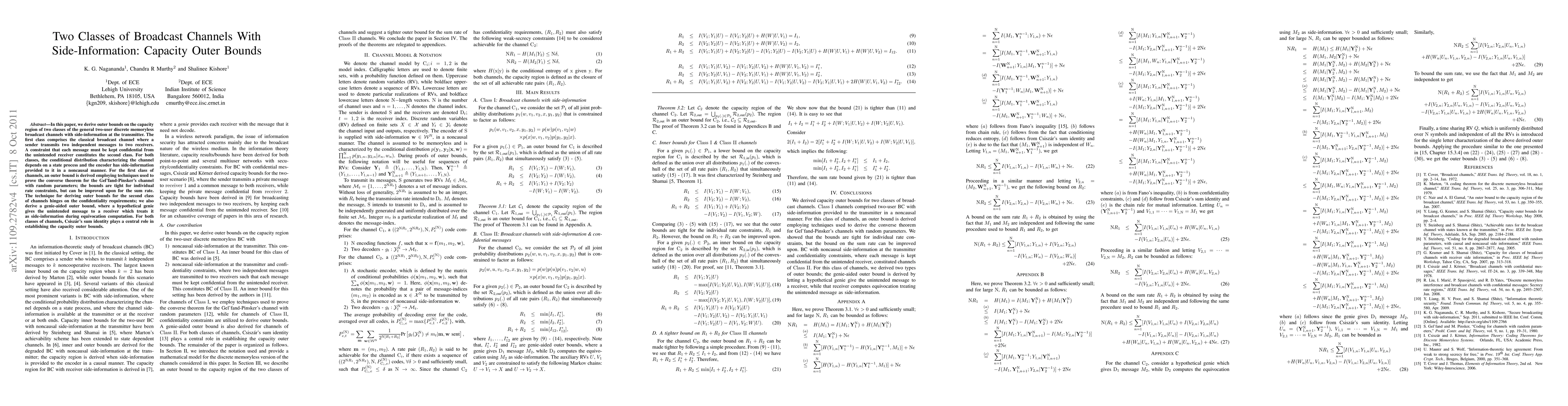 This paper derives outer bounds for the capacity region of two classes of two-user discrete memoryless broadcast channels, focusing on confidentiality in the second class. Techniques from Gel'fand-Pinsker's channel and Csiszár's sum identity are used to establish bounds, with the second class incorporating a genie-aided approach to address confidentiality requirements.