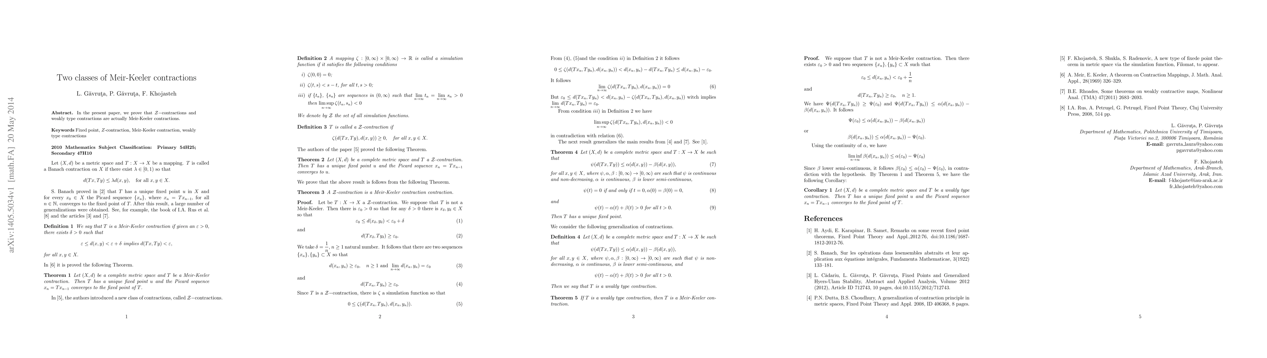 Summary: This paper demonstrates that Z-contractions and weakly type contractions fall under the category of Meir-Keeler contractions, expanding the understanding of contraction mappings in fixed-point theory.