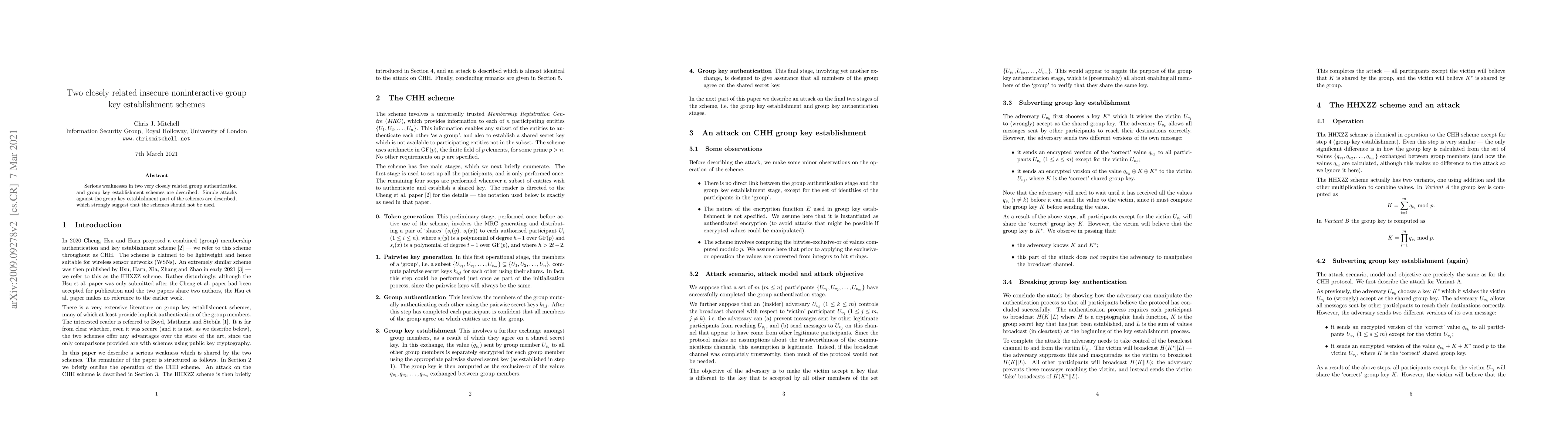 Summary: This paper identifies critical vulnerabilities in two similar group key establishment schemes, demonstrating simple yet effective attacks that render them insecure and advising against their use.