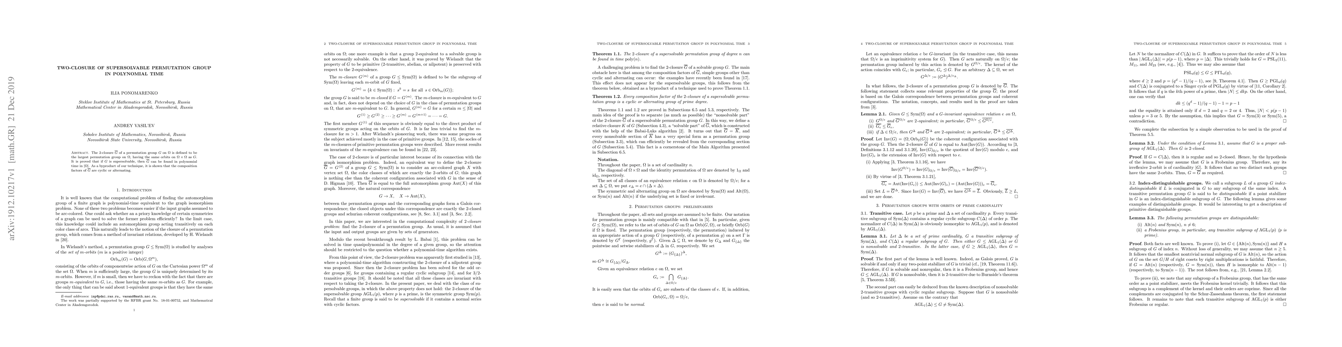 The $2$-closure $\overline{G}$ of a permutation group $G$ on $\Omega$ is defined to be the largest permutation group on $\Omega$, having the same orbits on $\Omega\times\Omega$ as $G$. It is proved that if $G$ is supersolvable, then $\overline{G}$ can be found in polynomial time in $|\Omega|$. As a byproduct of our technique, it is shown that the composition factors of $\overline{G}$ are cyclic or alternating of prime degree.