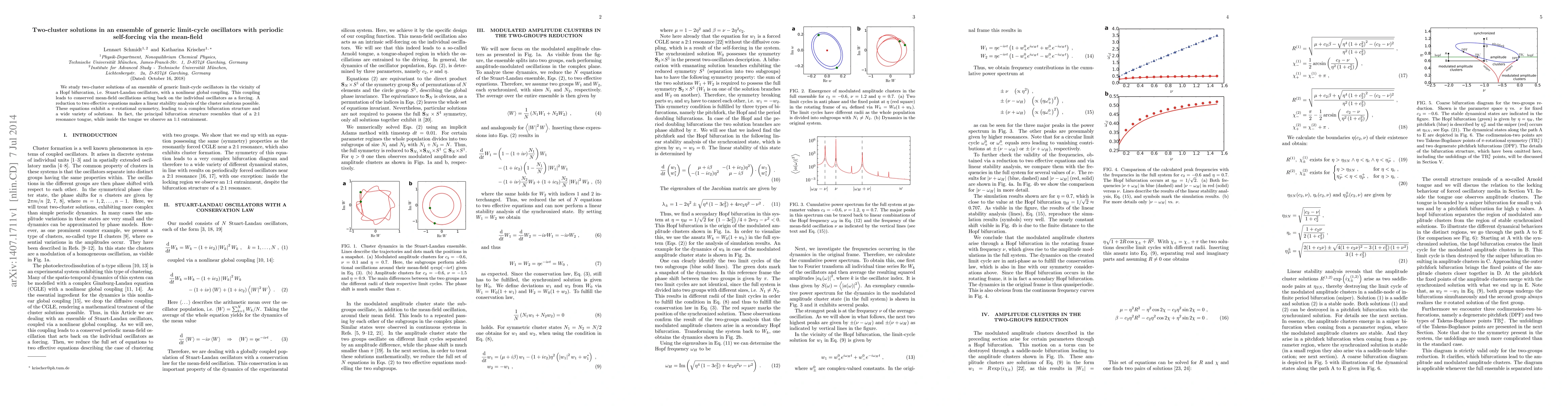 We study two-cluster solutions of an ensemble of generic limit-cycle oscillators in the vicinity of a Hopf bifurcation, i.e. Stuart-Landau oscillators, with a nonlinear global coupling. This coupling leads to conserved mean-field oscillations acting back on the individual oscillators as a forcing. A reduction to two effective equations makes a linear stability analysis of the cluster solutions possible. These equations exhibit a $\pi$-rotational symmetry, leading to a complex bifurcation structure and a wide variety of solutions. In fact, the principal bifurcation structure resembles that of a 2:1 resonance tongue, while inside the tongue we observe an 1:1 entrainment.