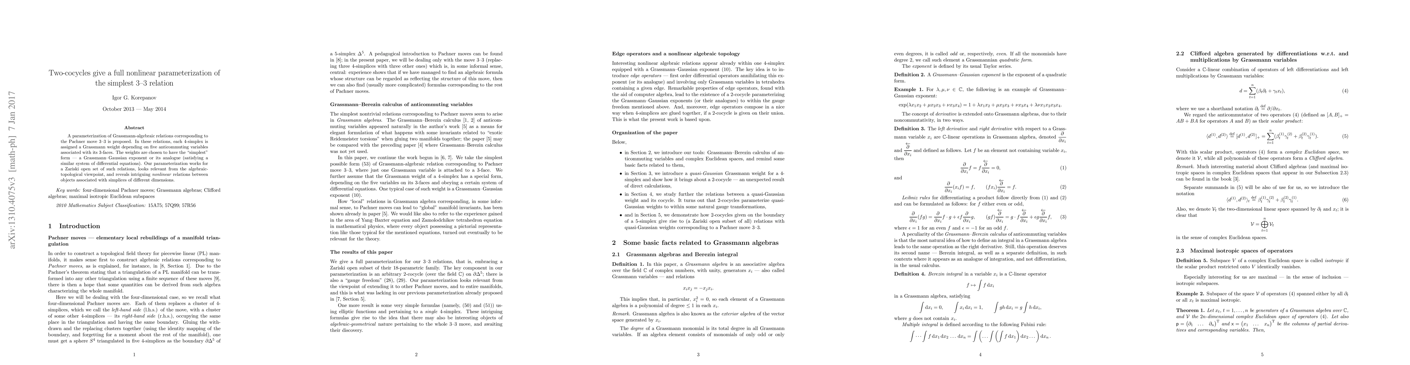 This paper proposes a Grassmann-algebraic parameterization of the 3-3 Pachner move using two-cocycles, which assigns Grassmann weights to 4-simplices based on five anticommuting variables. The parameterization reveals nonlinear relations between simplices of different dimensions and is relevant from an algebraic-topological perspective.