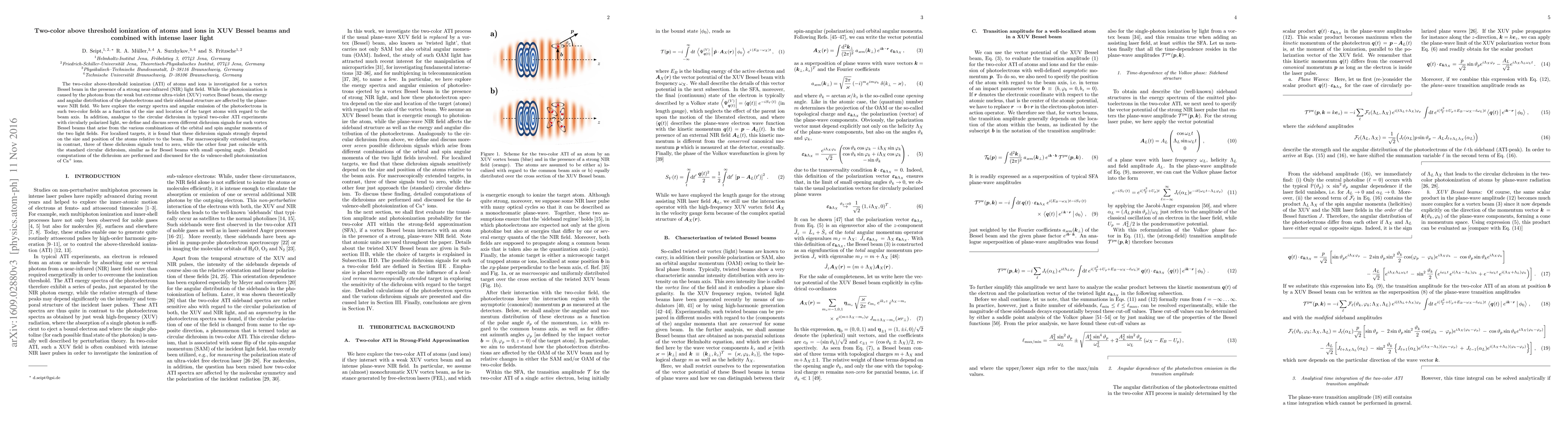 This paper investigates the two-color above-threshold ionization of atoms and ions using a vortex Bessel beam in XUV light combined with a strong NIR laser field, exploring the photoelectron energy and angular distributions. It defines and discusses seven dichroism signals arising from the interaction of the two light fields, showing that their dependence on target size and position varies significantly between localized and extended targets.
