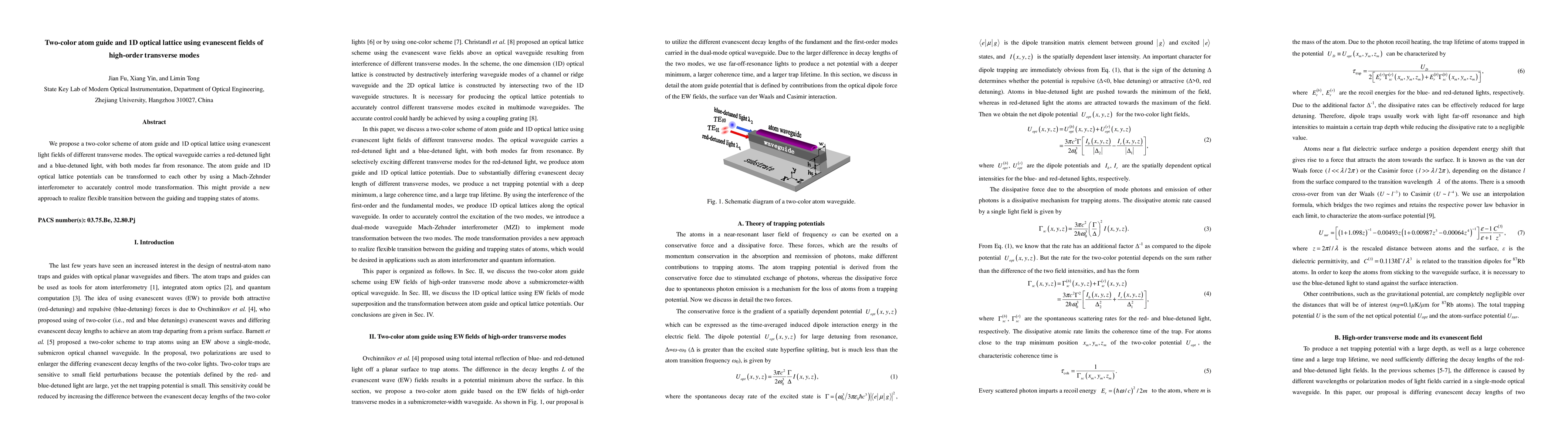 We propose a two-color scheme of atom guide and 1D optical lattice using evanescent light fields of different transverse modes. The optical waveguide carries a red-detuned light and a blue-detuned light, with both modes far from resonance. The atom guide and 1D optical lattice potentials can be transformed to each other by using a Mach-Zehnder interferometer to accurately control mode transformation. This might provide a new approach to realize flexible transition between the guiding and trapping states of atoms.