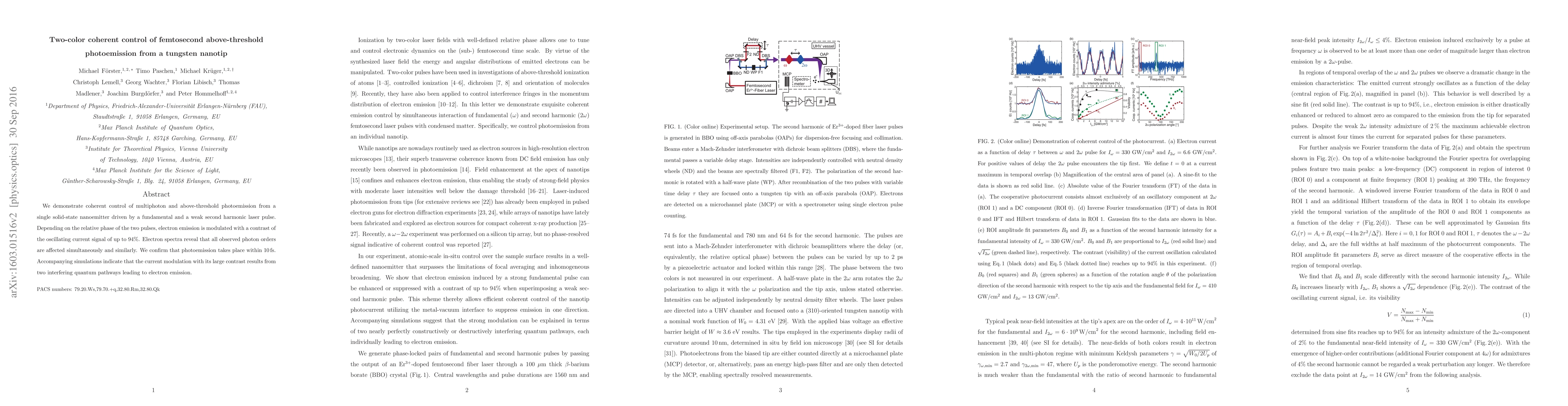 This paper demonstrates coherent control over femtosecond above-threshold photoemission from a tungsten nanotip using two laser pulses, achieving up to 94% modulation in electron emission based on the relative phase of the pulses. Simulations suggest that the observed modulation arises from interference between two quantum pathways.