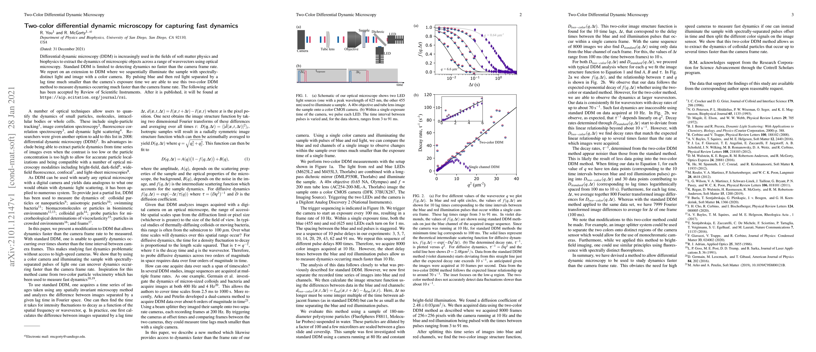 This paper introduces a two-color differential dynamic microscopy (DDM) technique that enhances the detection of fast microscopic dynamics by sequentially illuminating samples with spectrally-distinct light and capturing images with a color camera, thus enabling measurements of dynamics faster than the camera frame rate.