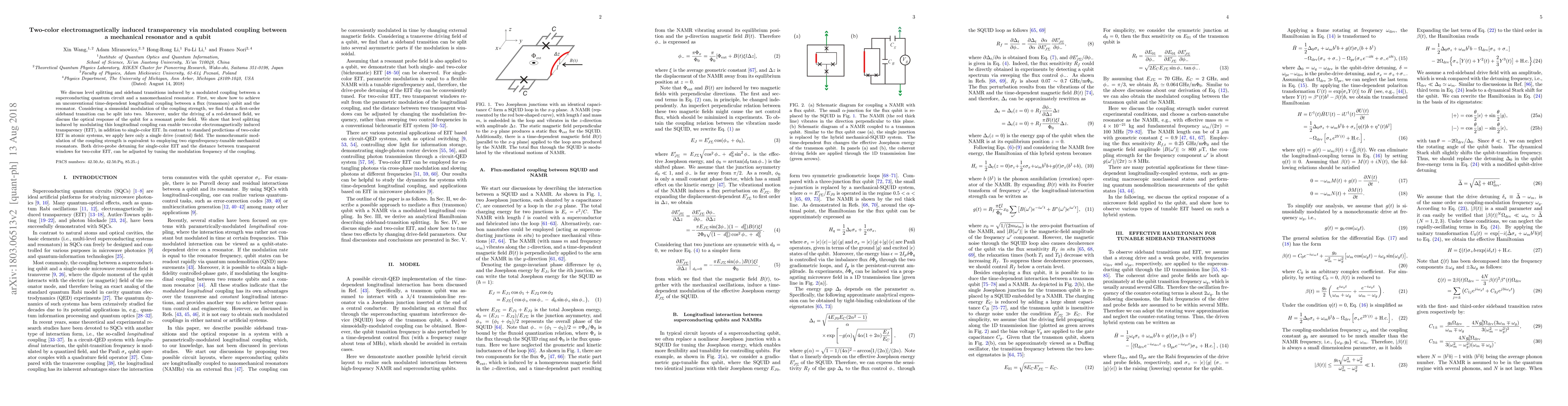 This paper explores modulated coupling between a superconducting qubit and a nanomechanical resonator, demonstrating how it can induce level splitting and sideband transitions. It shows that modulating the coupling strength can enable two-color electromagnetically induced transparency (EIT) using a single control field, adjusting the modulation frequency to control the optical response and transparent windows.
