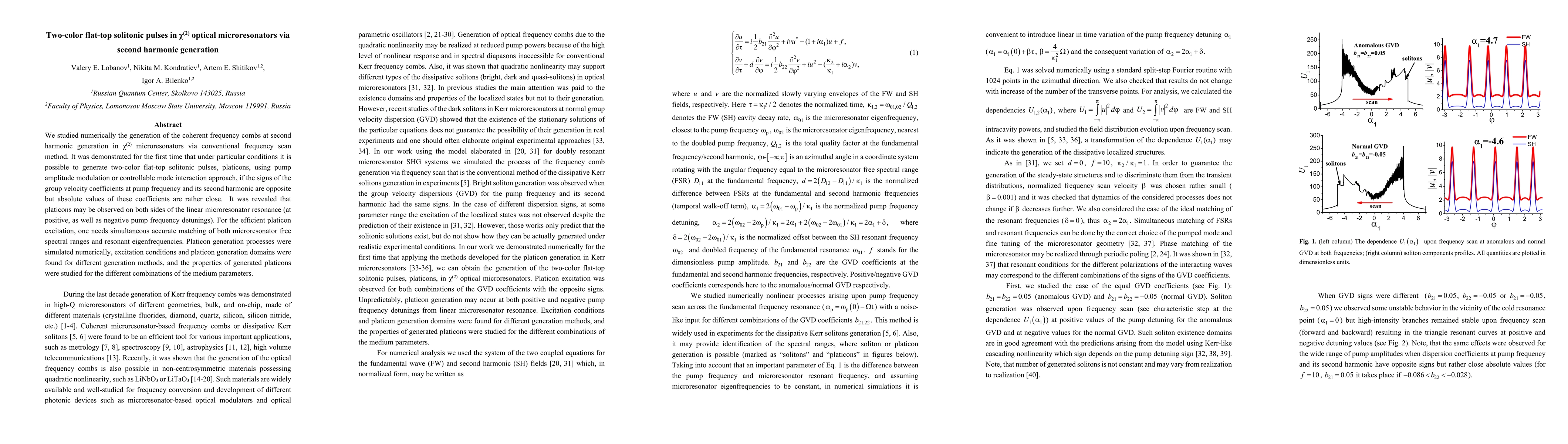 This paper numerically investigates the generation of coherent frequency combs in $\chi^{(2)}$ microresonators via second harmonic generation, demonstrating the first observation of two-color flat-top solitonic pulses, or platicons, under specific conditions involving opposite group velocity coefficients. The study reveals that platicons can be generated on both sides of the microresonator resonance, with efficient excitation requiring precise matching of free spectral ranges and eigenfrequencies.