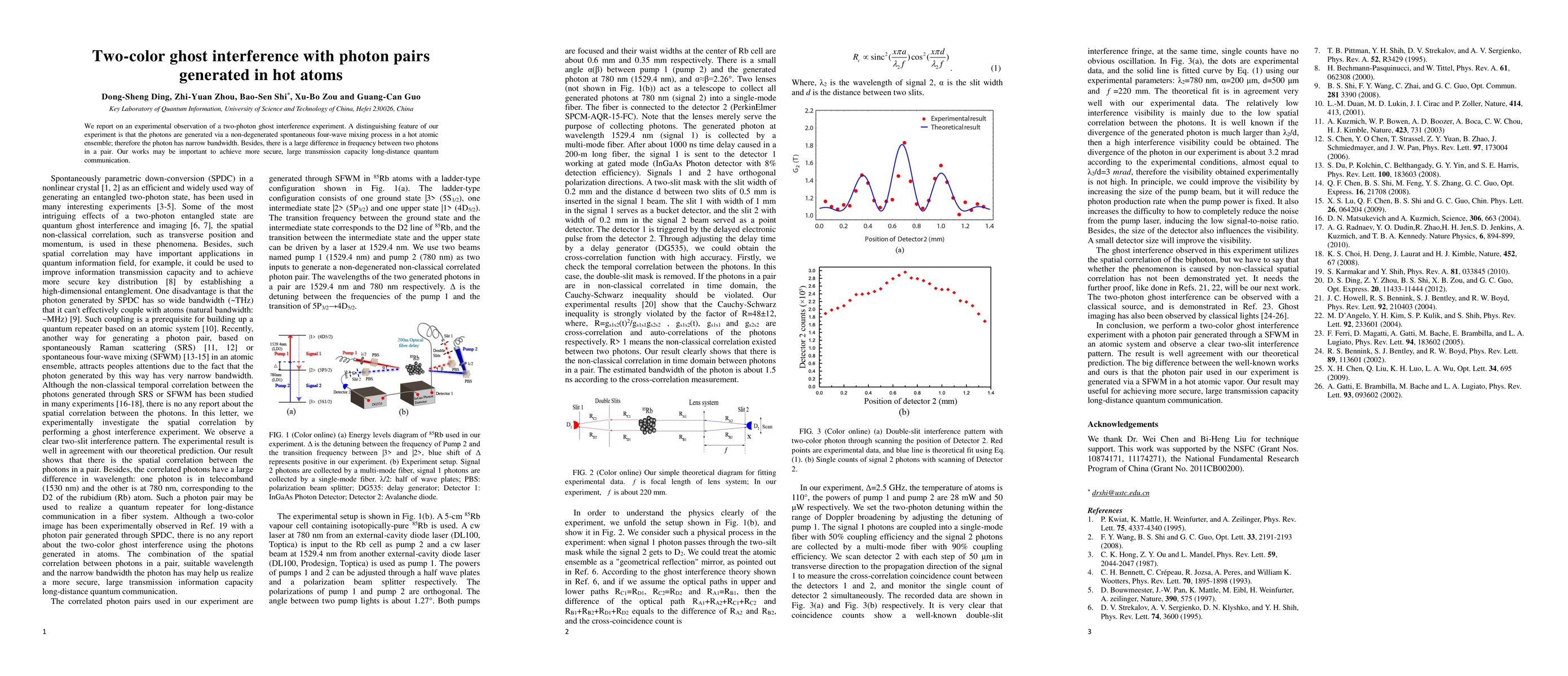 This paper reports on a two-photon ghost interference experiment where photons are generated through non-degenerate spontaneous four-wave mixing in hot atoms, highlighting potential for secure, high-capacity long-distance quantum communication.