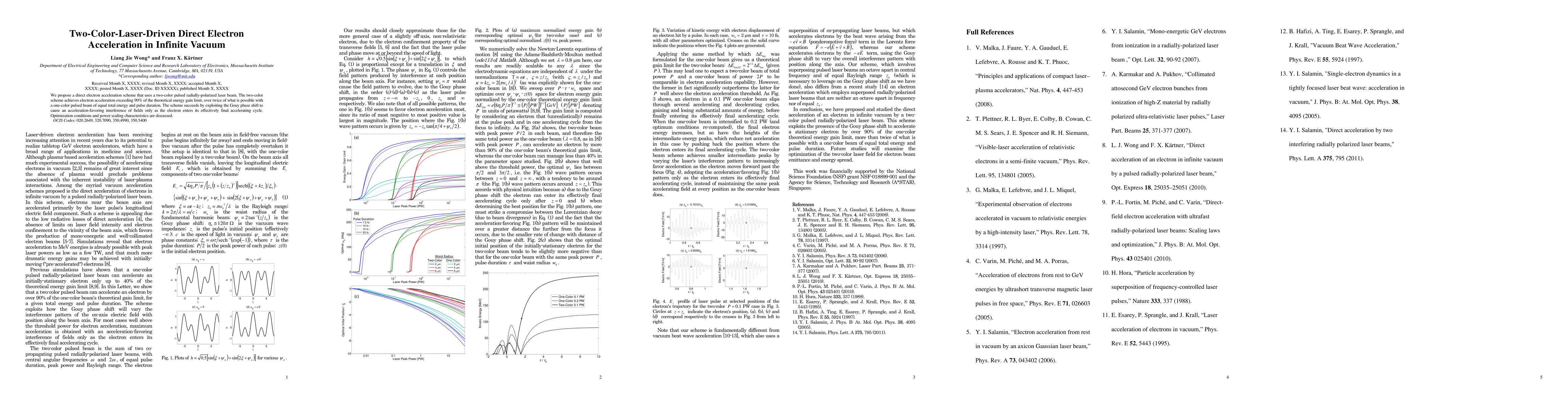 This paper proposes a two-color laser-driven electron acceleration method using a radially-polarized laser beam, achieving over 90% of the theoretical energy gain limit, significantly outperforming single-color methods. The technique leverages the Gouy phase shift for optimal interference during the final acceleration cycle.