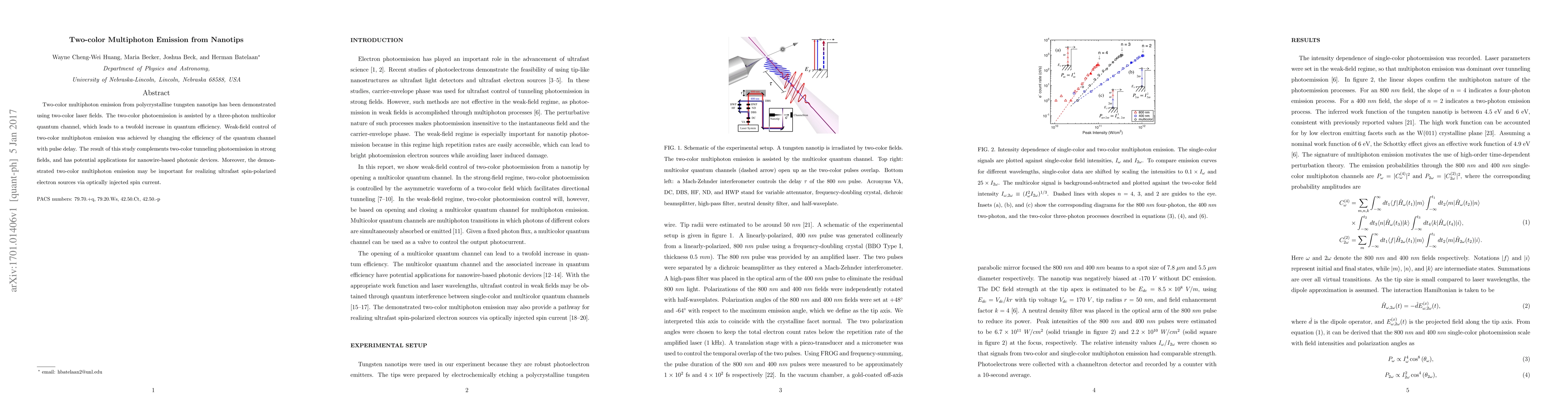 This study demonstrates two-color multiphoton emission from tungsten nanotips using dual-color laser fields, facilitated by a three-photon quantum channel, enhancing quantum efficiency. The control of emission is achieved through pulse delay manipulation, with potential applications in nanowire photonic devices and ultrafast spin-polarized electron sources.