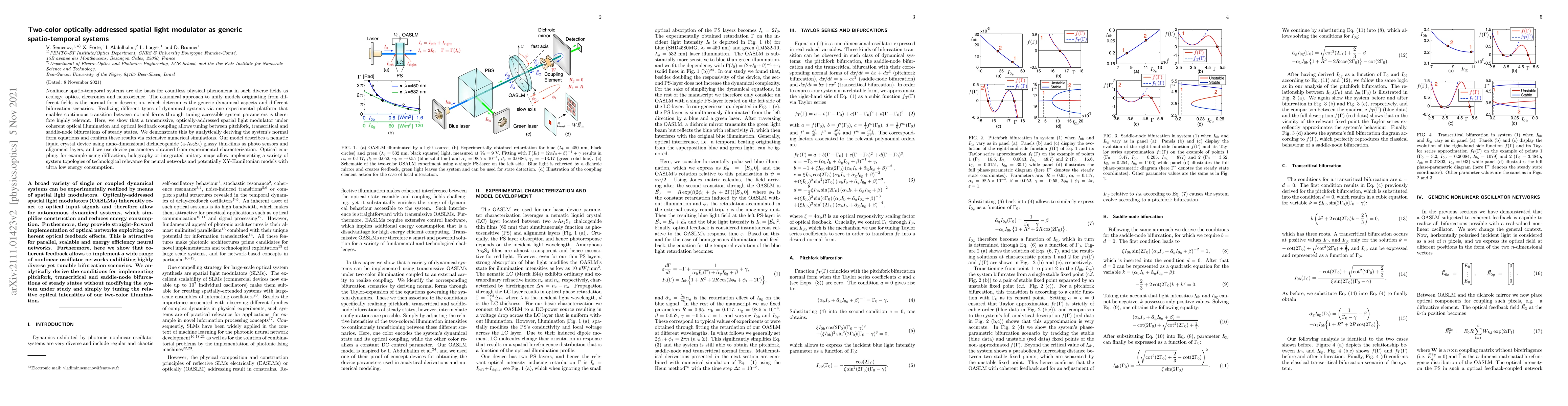 This paper demonstrates a two-color optically-addressed spatial light modulator that can tune between different types of spatio-temporal bifurcations, including pitchfork, transcritical, and saddle-node, through continuous parameter adjustments. The model, based on a nematic liquid crystal device, shows potential applications in neural networks and low-energy XY-Hamiltonian models.