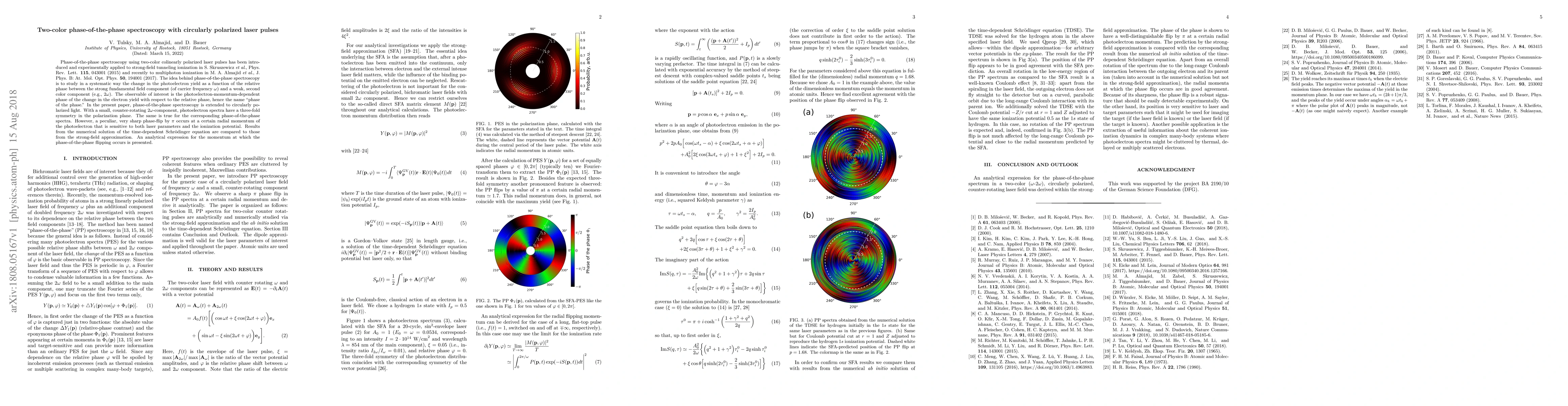 Phase-of-the-phase spectroscopy using two-color colinearly polarized laser pulses has been introduced and experimentally applied to strong-field tunneling ionization in S. Skruszewicz et al., Phys. Rev. Lett. 115, 043001 (2015) and recently to multiphoton ionization in M. A. Almajid et al., J. Phys. B: At. Mol. Opt. Phys. 50, 194001 (2017). The idea behind phase-of-the-phase spectroscopy is to study in a systematic way the change in the photoelectron yield as a function of the relative phase between the strong fundamental field component (of carrier frequency $\omega$) and a weak, second color component (e.g., $2\omega$). The observable of interest is the photoelectron-momentum-dependent phase of the change in the electron yield with respect to the relative phase, hence the name "phase of the phase." In the present paper, phase-of-the-phase spectroscopy is extended to circularly polarized light. With a small, counter-rotating $2\omega$-component, photoelectron spectra have a three-fold symmetry in the polarization plane. The same is true for the corresponding phase-of-the-phase spectra. However, a peculiar, very sharp phase-flip by $\pi$ occurs at a certain radial momentum of the photoelectron that is sensitive to both laser parameters and the ionization potential. Results from the numerical solution of the time-dependent Schr\"odinger equation are compared to those from the strong-field approximation. An analytical expression for the momentum at which the phase-of-the-phase flipping occurs is presented.