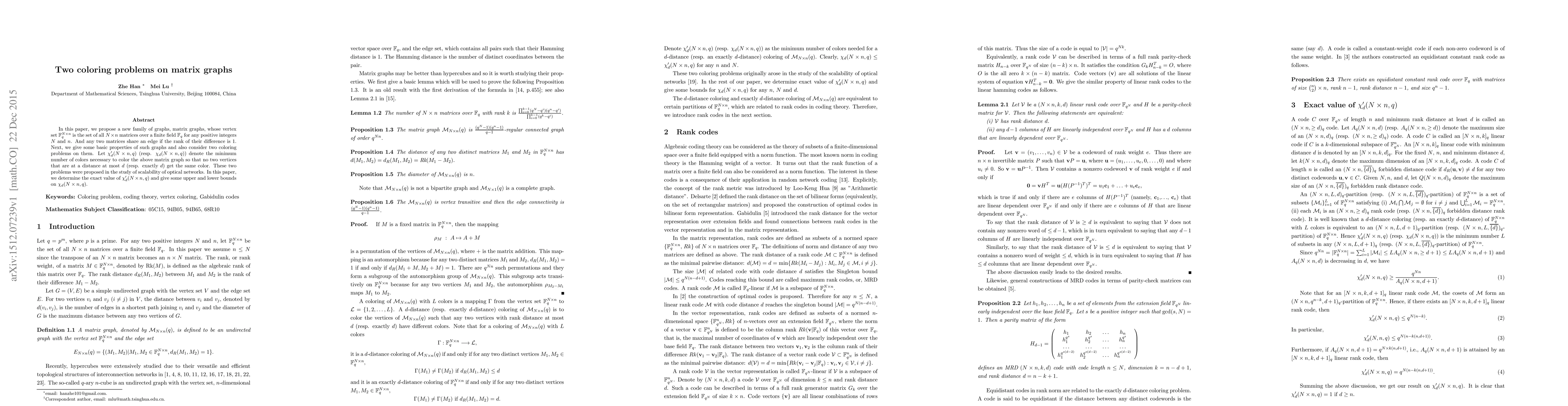 In this paper, we propose a new family of graphs, matrix graphs, whose vertex set $\mathbb{F}^{N\times n}_q$ is the set of all $N\times n$ matrices over a finite field $\mathbb{F}_q$ for any positive integers $N$ and $n$. And any two matrices share an edge if the rank of their difference is $1$. Next, we give some basic properties of such graphs and also consider two coloring problems on them. Let $\chi'_d(N\times n, q)$ (resp. $\chi_d(N\times n, q)$) denote the minimum number of colors necessary to color the above matrix graph so that no two vertices that are at a distance at most $d$ (resp. exactly $d$) get the same color. These two problems were proposed in the study of scalability of optical networks. In this paper, we determine the exact value of $\chi'_d(N\times n,q)$ and give some upper and lower bounds on $\chi_d(N\times n,q)$.