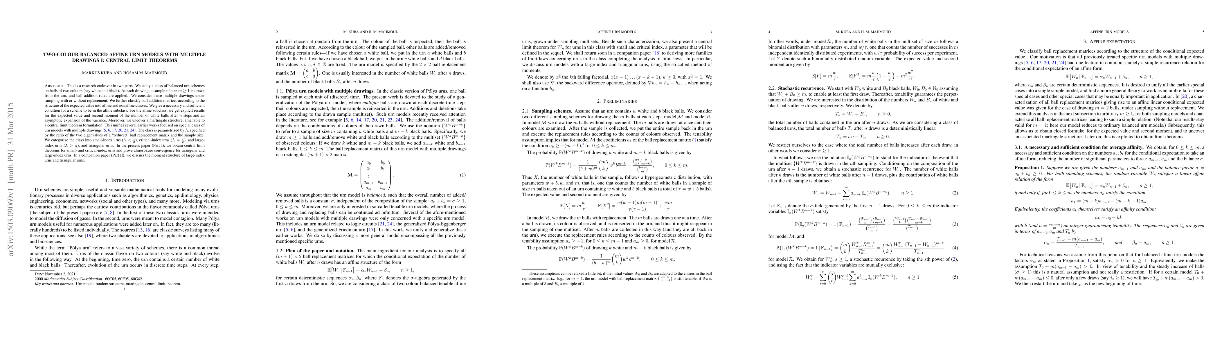 This is a research endeavor in two parts. We study a class of balanced urn schemes on balls of two colours (say white and black). At each drawing, a sample of size $m\ge 1$ is drawn from the urn, and ball addition rules are applied. We consider these multiple drawings under sampling with or without replacement. We further classify ball addition matrices according to the structure of the expected value into affine and nonaffine classes. We give a necessary and sufficient condition for a scheme to be in the affine subclass. For the affine subclass, we get explicit results for the expected value and second moment of the number of white balls after $n$ steps and an asymptotic expansion of the variance. Moreover, we uncover a martingale structure, amenable to a central limit theorem formulation. This unifies several earlier works focused on special cases of urn models with multiple drawings. The class is parametrized by $\Lambda$, specified by the ratio of the two eigenvalues of a "reduced" ball replacement matrix and the sample size. We categorize the class into small-index urns ($\Lambda <\frac 1 2$), critical-index urns ($\Lambda = \frac 1 2$), and large-index urns ($\Lambda > \frac 1 2$), and triangular urns. In the present paper (Part I), we obtain central limit theorems for small- and critical-index urns and prove almost-sure convergence for triangular and large-index urns. In a companion paper (Part II), we discuss the moment structure of large-index urns and triangular urns.