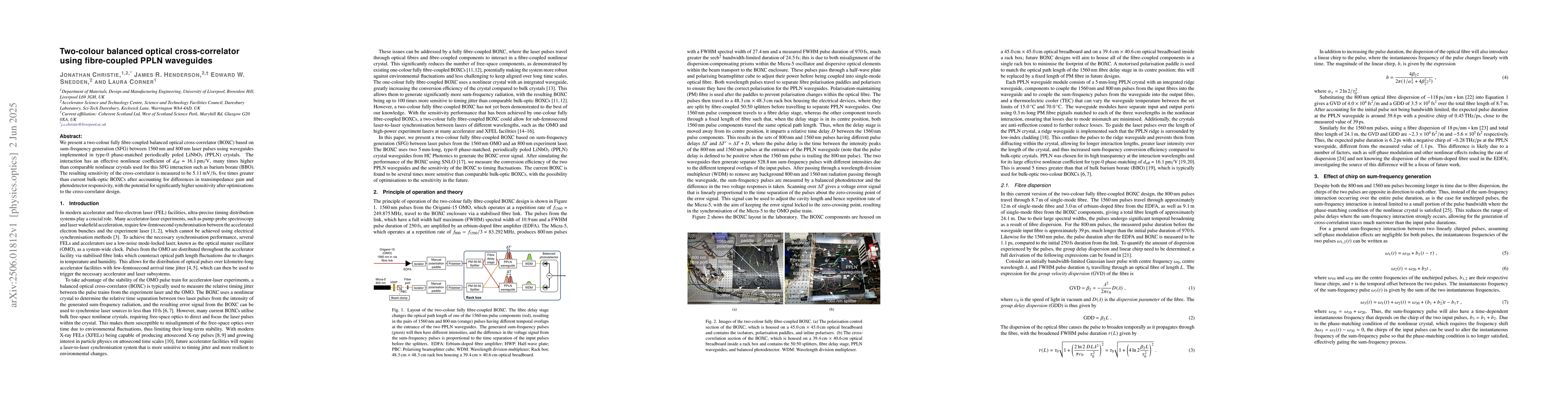 The research presents a two-colour fully fibre-coupled balanced optical cross-correlator (BOXC) using sum-frequency generation (SFG) between 1560 nm and 800 nm laser pulses in waveguides implemented in type-0 phase-matched periodically poled LiNbO₃ (PPLN) crystals.