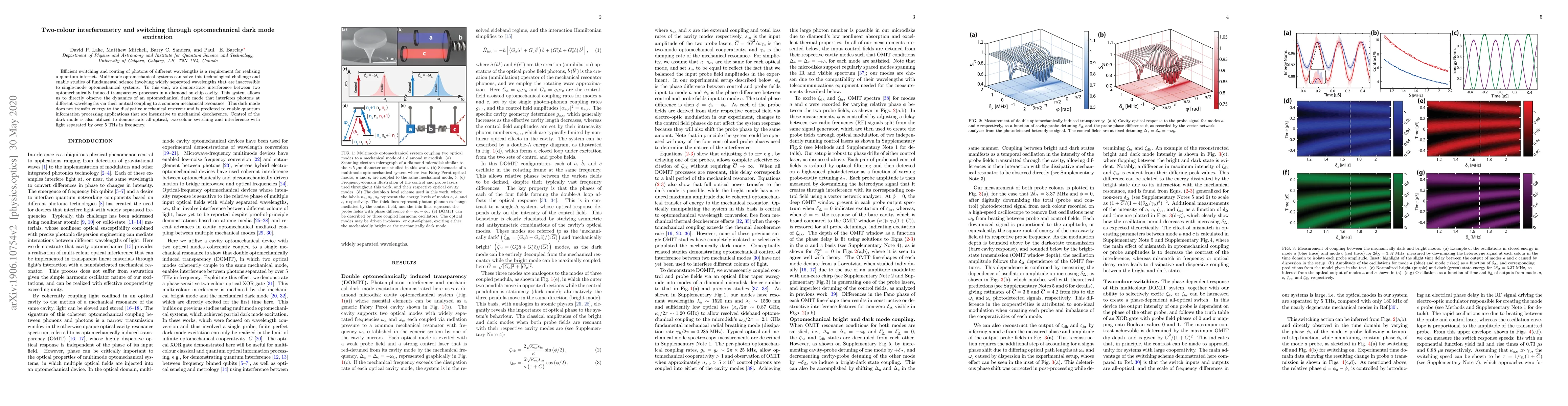 This paper demonstrates efficient photon switching and routing using two-colour interferometry through optomechanical dark mode excitation in a diamond on-chip cavity. The system enables interference between different wavelengths and showcases the potential for quantum information processing by utilizing the dark mode's immunity to mechanical decoherence.