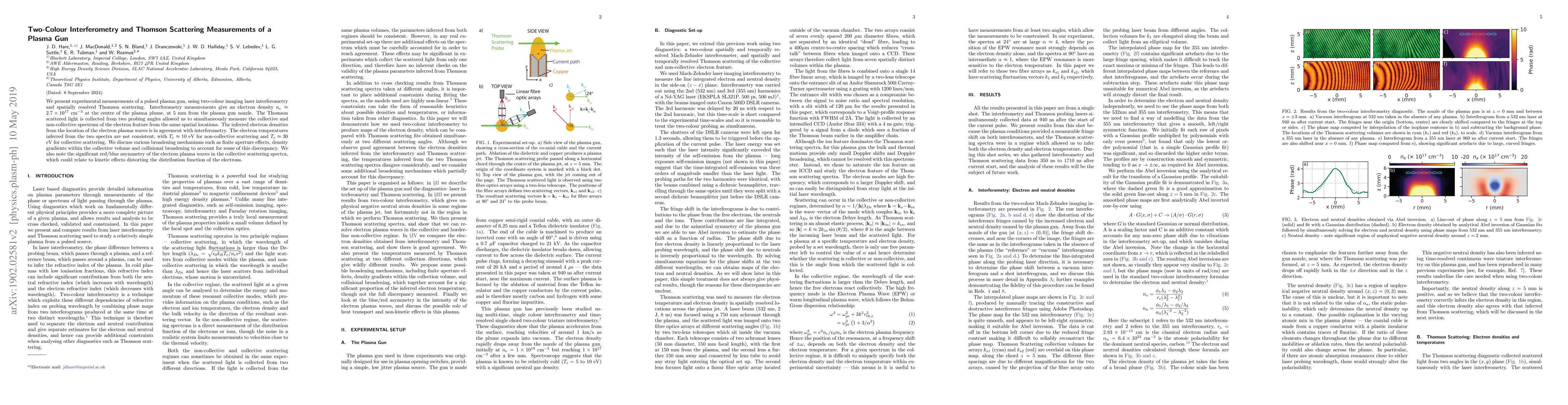 This paper reports on experimental measurements of a pulsed plasma gun using two-colour interferometry and Thomson scattering, finding electron densities of $n_e\approx2.7\times10^{17}$ cm$^{-3}$ and differing electron temperatures from collective and non-collective scattering spectra, attributing discrepancies to broadening mechanisms and kinetic effects.