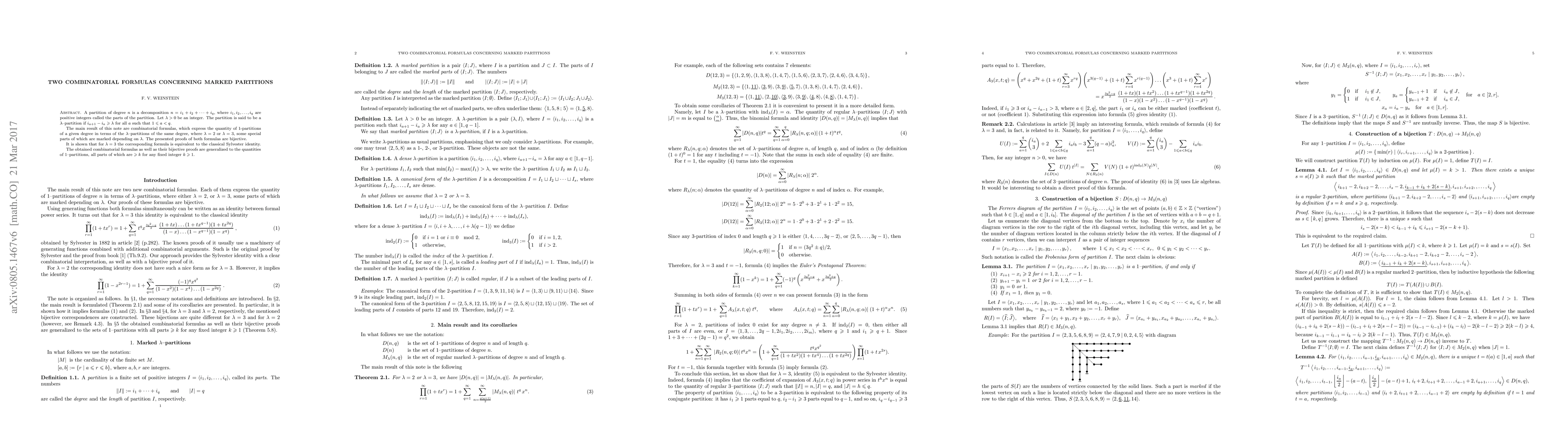 This paper presents combinatorial formulas relating the number of 1-partitions of a given degree to λ-partitions, where λ equals 2 or 3, with specific parts marked. The proofs for these formulas are bijective and generalize to partitions where all parts are greater than or equal to any fixed integer k.