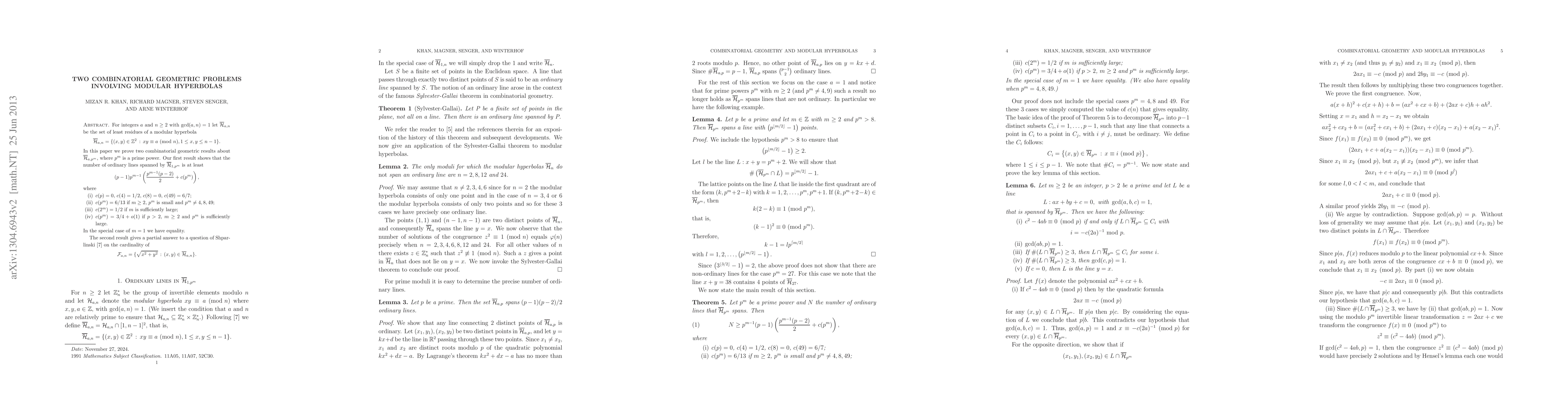 We give a lower bound for the number of ordinary lines spanned by a modular hyperbola when the modulus is a prime power. We also give a partial answer to a question of Shparlinski.