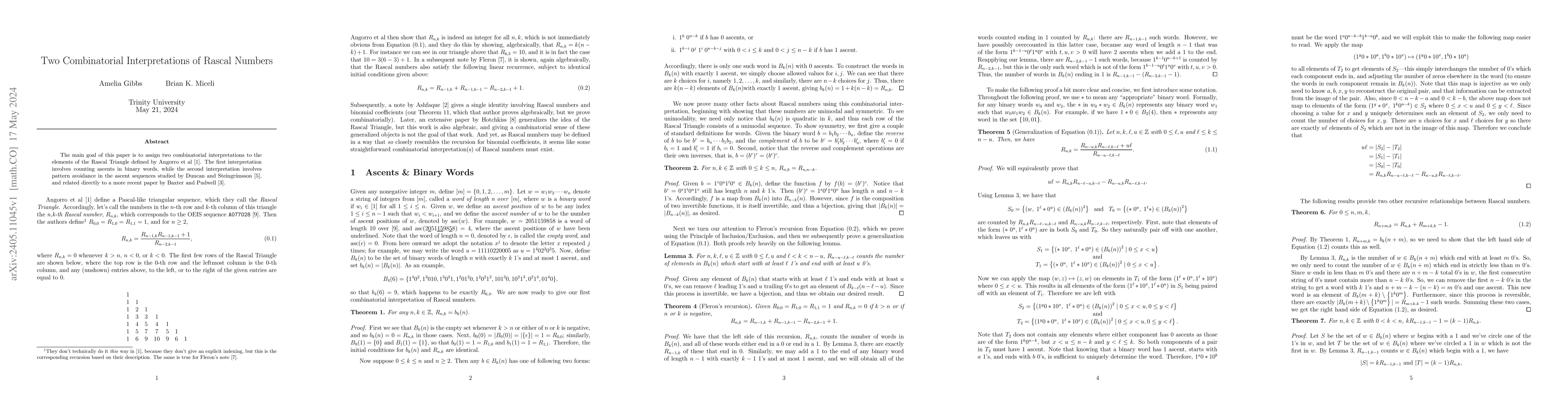 The paper assigns two combinatorial interpretations to elements of the Rascal Triangle, involving counting ascents in binary words and pattern avoidance in ascent sequences, linking to previous works by Duncan and Steingrímsson, and Baxter and Pudwell.