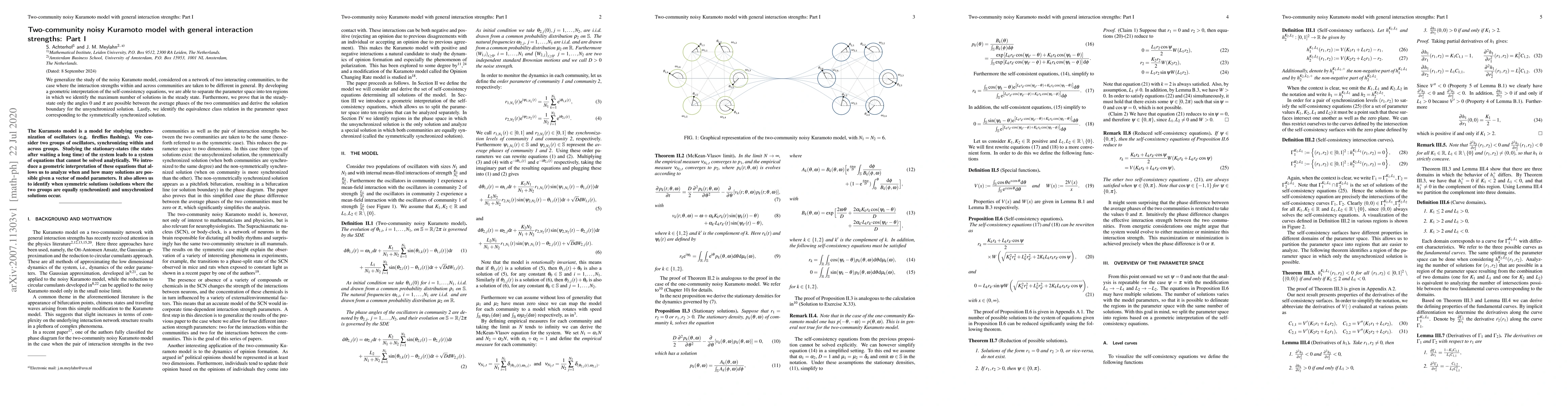 Researchers generalized a study on two interacting communities in a noisy Kuramoto model, identifying ten regions of parameter space with varying interaction strengths within and across communities, and proving constraints on possible angle differences between community phases.