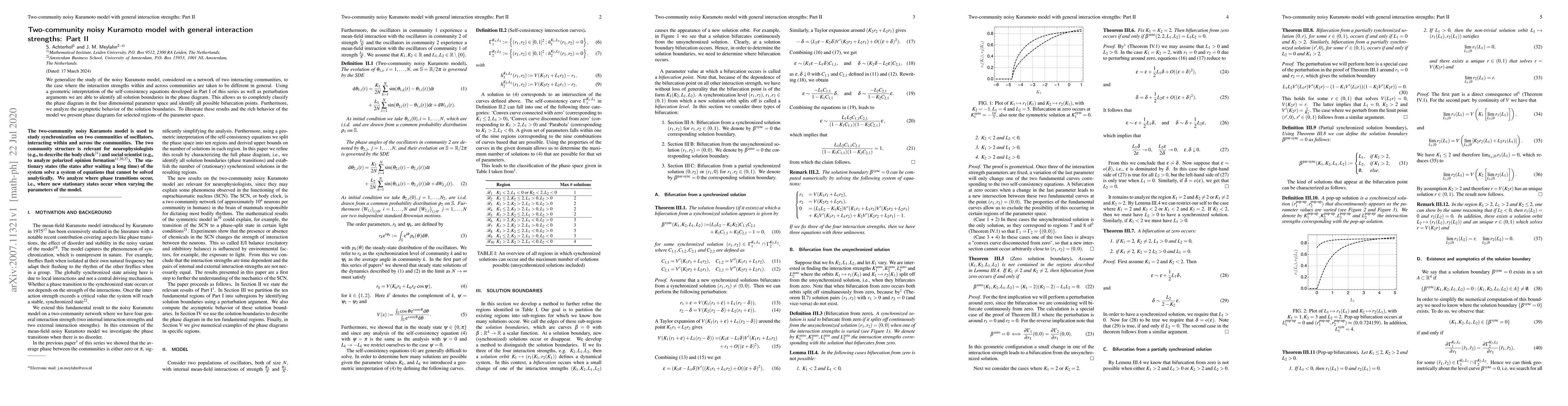 We generalize the study of the noisy Kuramoto model, considered on a network of two interacting communities, to the case where the interaction strengths within and across communities are taken to be different in general. Using a geometric interpretation of the self-consistency equations developed in Part I of this series as well as perturbation arguments we are able to identify all solution boundaries in the phase diagram. This allows us to completely classify the phase diagram in the four dimensional parameter space and identify all possible bifurcation points. Furthermore, we analyze the asymptotic behavior of the solution boundaries. To illustrate these results and the rich behavior of the model we present phase diagrams for selected regions of the parameter space.
