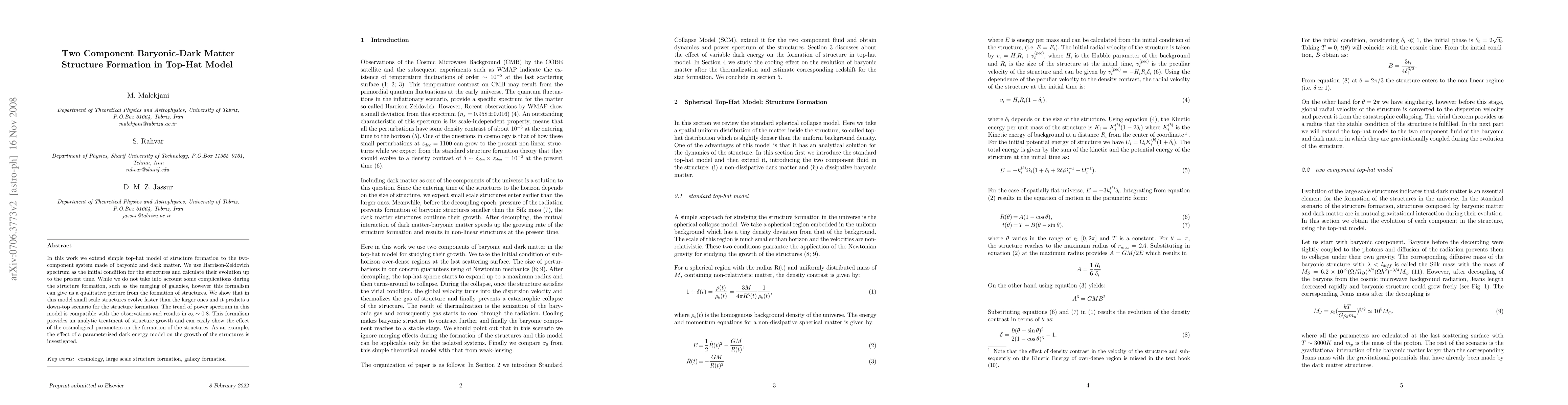 In this work we extend simple top-hat model of structure formation to the two-component system made of baryonic and dark matter. We use Harrison-Zeldovich spectrum as the initial condition for the structures and calculate their evolution up to the present time. While we do not take into account some complications during the structure formation, such as the merging of galaxies, however this formalism can give us a qualitative picture from the formation of structures. We show that in this model small scale structures evolve faster than the larger ones and it predicts a down-top scenario for the structure formation. The trend of power spectrum in this model is compatible with the observations and results in $\sigma_8 \sim 0.8$. This formalism provides an analytic treatment of structure growth and can easily show the effect of the cosmological parameters on the formation of the structures. As an example, the effect of a parameterized dark energy model on the growth of the structures is investigated.