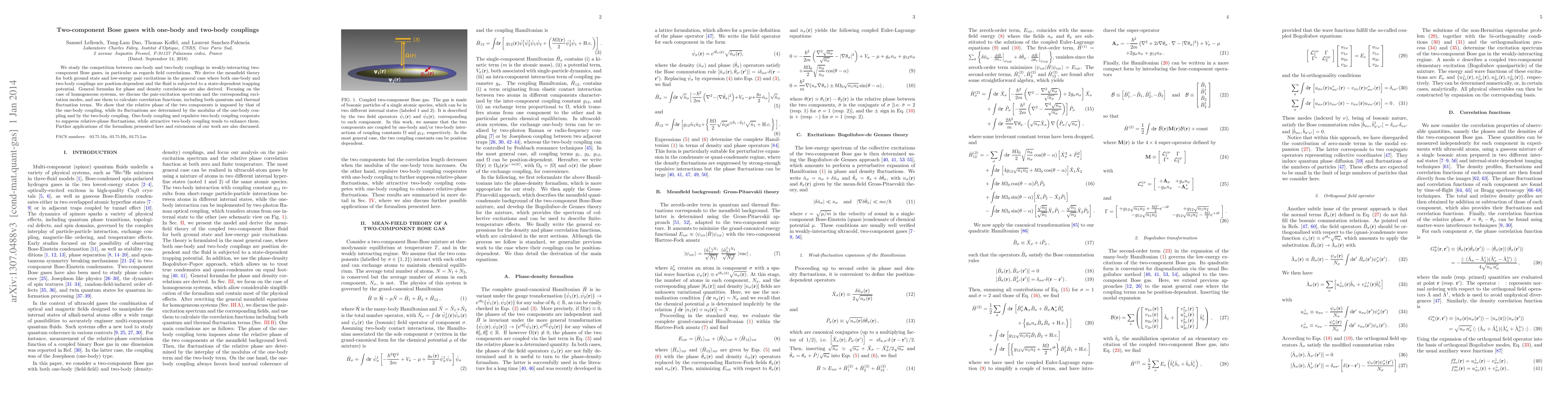 This research explores the interplay of one-body and two-body couplings in weakly-interacting two-component Bose gases, focusing on field correlations. It derives meanfield theory for ground states and pair excitations, considering position-dependent couplings and trapping potentials. Key findings include the dominant role of one-body coupling in setting relative phase, with fluctuations influenced by both one-body and two-body couplings. The study reveals that repulsive two-body coupling suppresses phase fluctuations, while attractive coupling enhances them, with potential applications and extensions discussed.