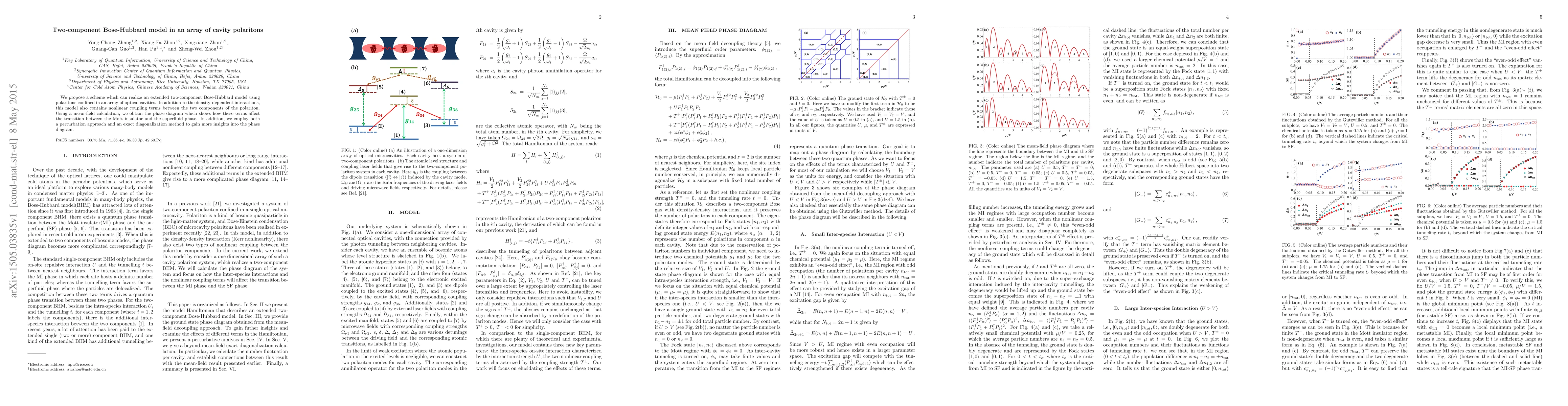 This paper proposes a scheme to implement an extended two-component Bose-Hubbard model using polaritons in optical cavity arrays, incorporating nonlinear coupling between components. The study uses mean-field calculations, perturbation, and exact diagonalization to explore the phase diagram and transition between Mott insulator and superfluid phases.
