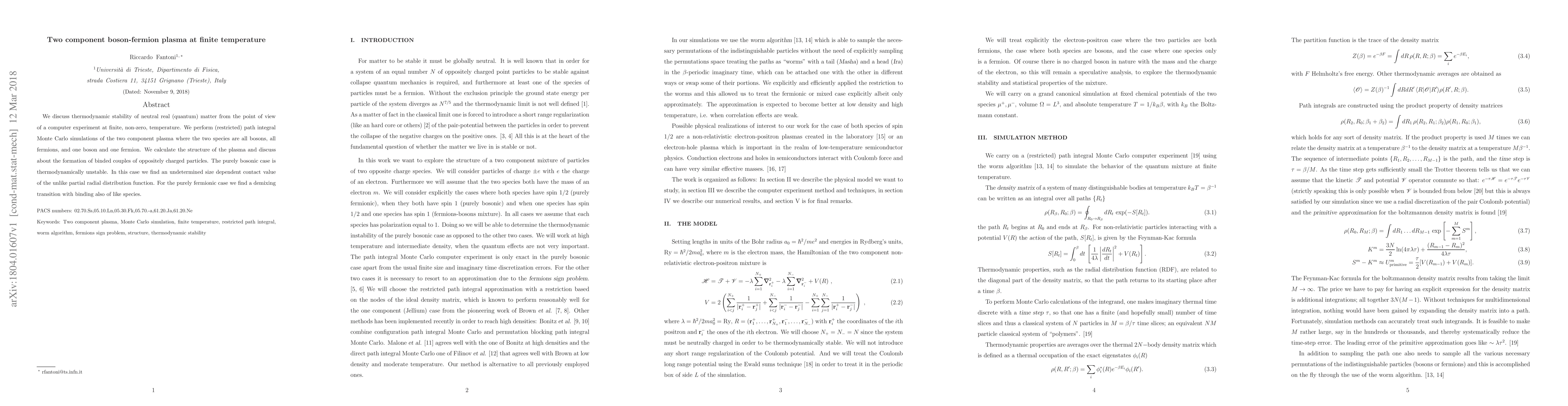 The paper presents a computer simulation study of two-component boson-fermion plasma at finite temperature. It reveals that the purely bosonic plasma is thermodynamically unstable, while the purely fermionic plasma undergoes demixing with binding of like species. The study uses path integral Monte Carlo simulations to analyze plasma structure and particle pairing.