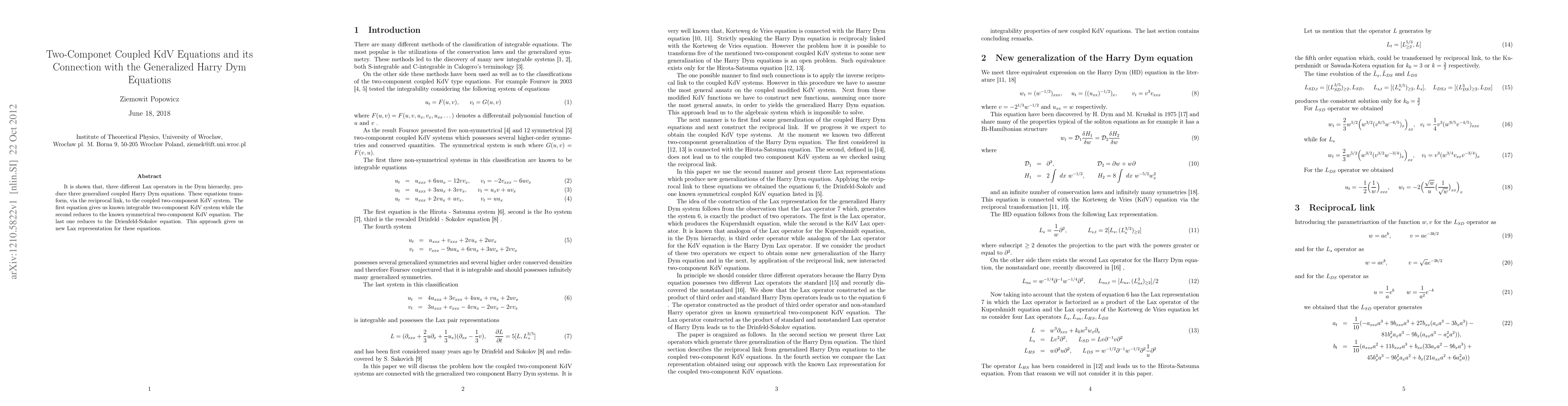 It is shown that, three different Lax operators in the Dym hierarchy, produce three generalized coupled Harry Dym equations. These equations transform, via the reciprocal link, to the coupled two-component KdV system. The first equation gives us known integrable two-component KdV system while the second reduces to the known symmetrical two-component KdV equation. The last one reduces to the Drienfeld-Sokolov equation. This approach gives us new Lax representation for these equations.